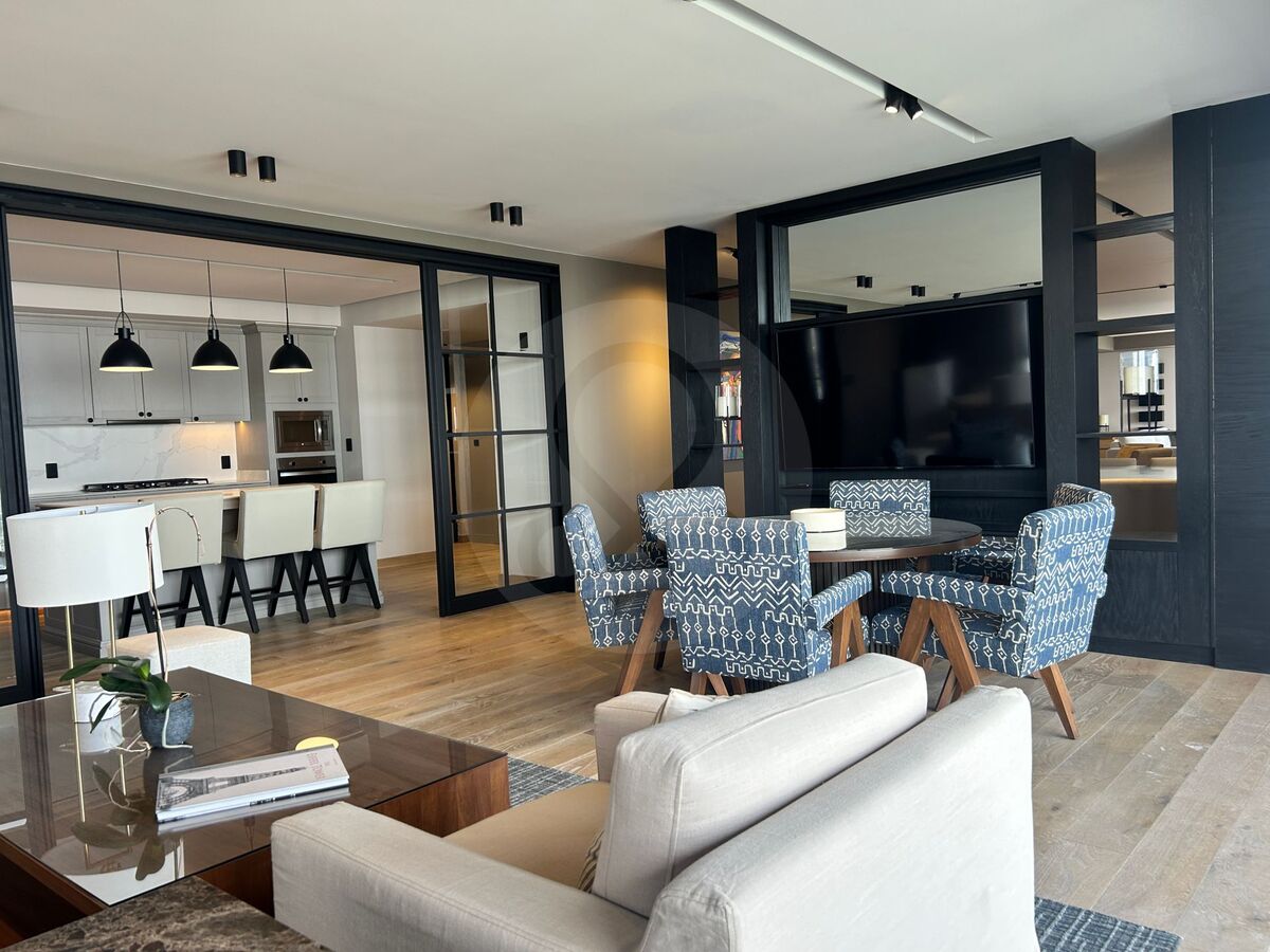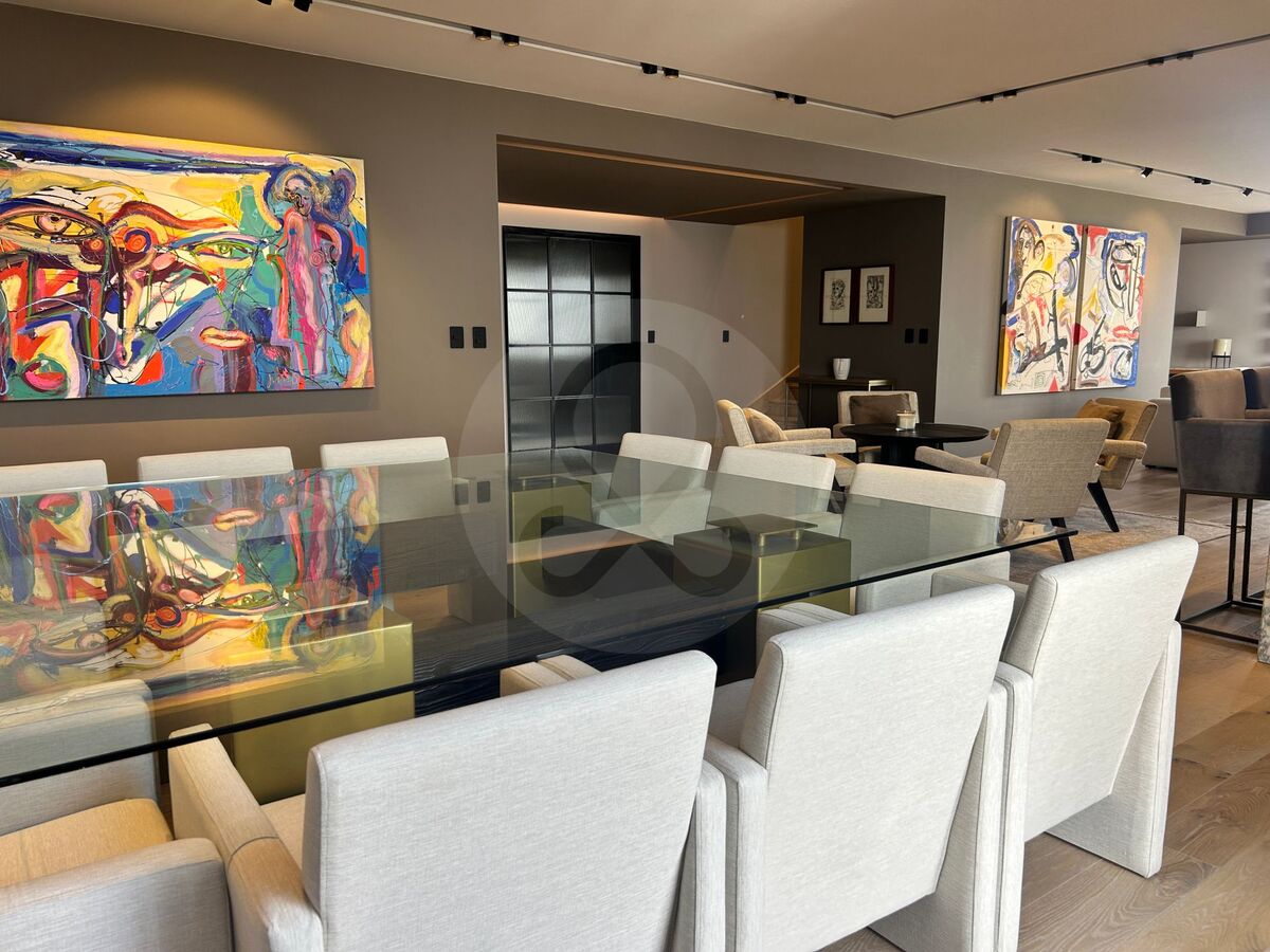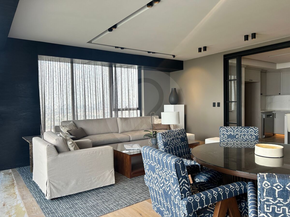 Este elegante departamento de lujo ofrece una sala y comedor integrados en un espacio abierto, moderno y lleno de luz natural gracias a sus ventanales de piso a techo con espectaculares vistas panorámicas.
