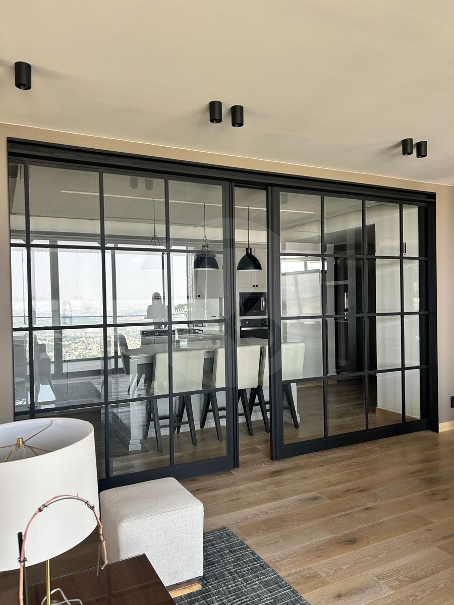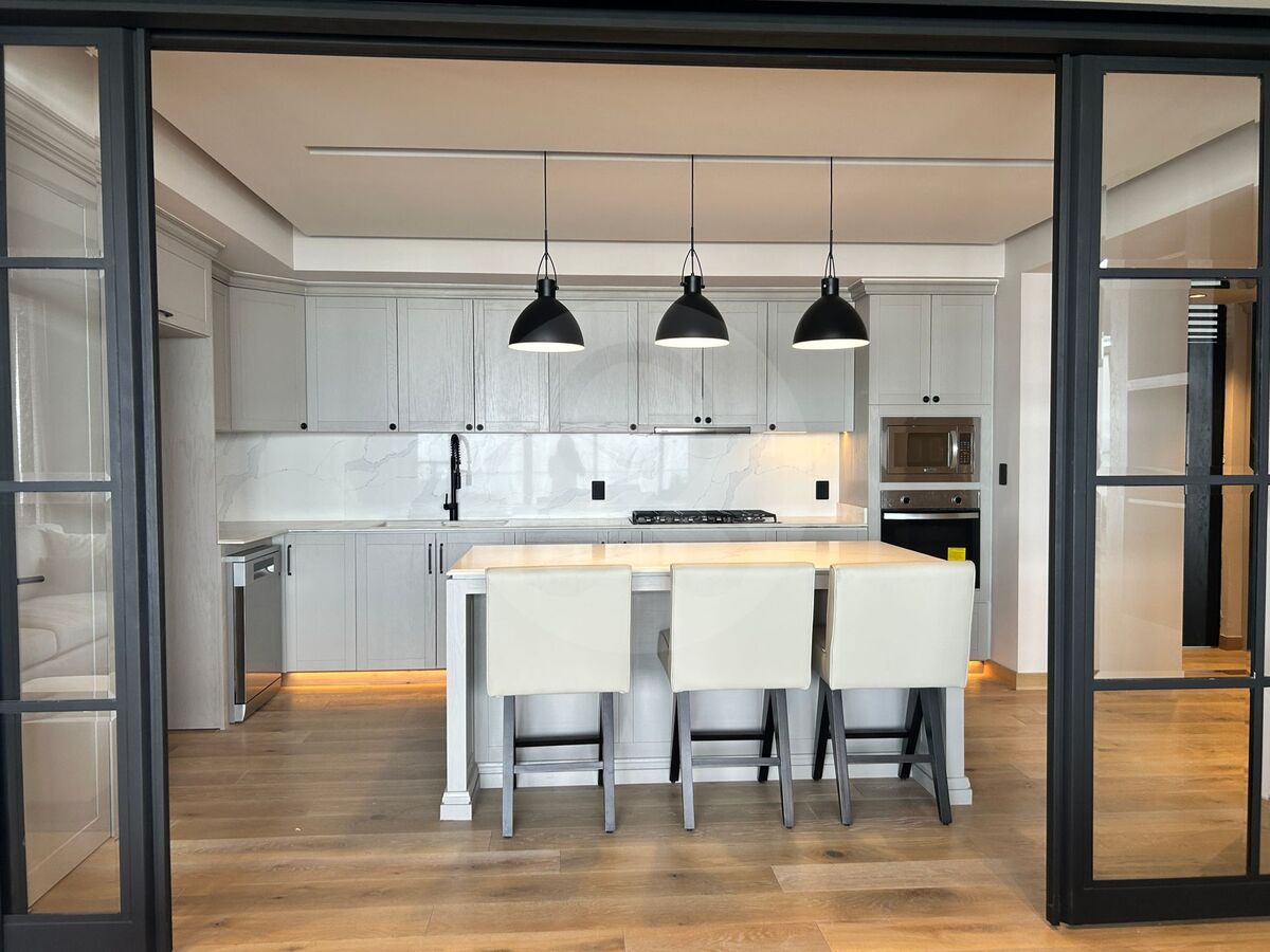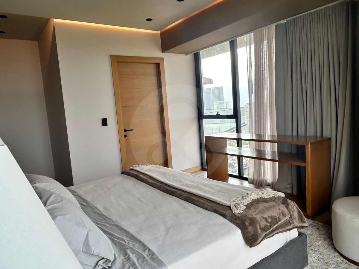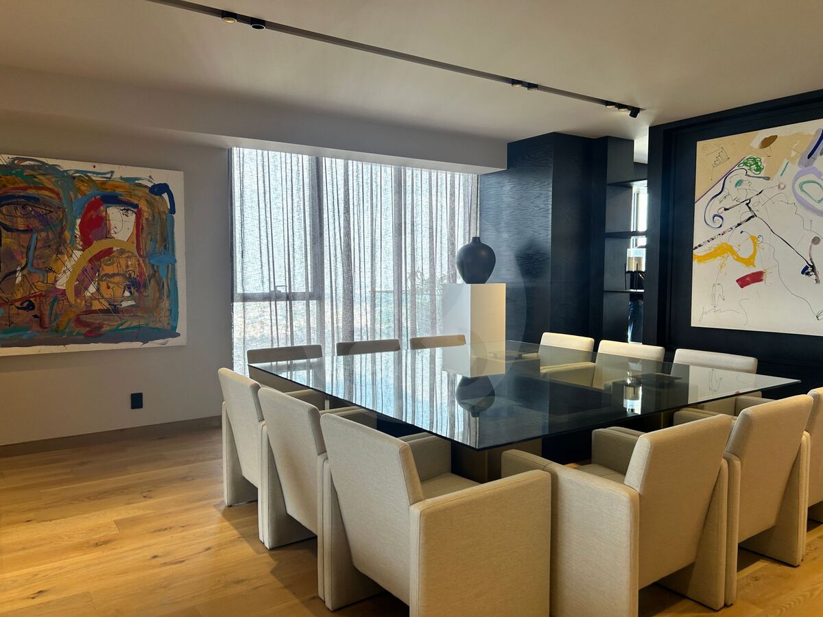 Este elegante departamento de lujo ofrece una sala y comedor integrados en un espacio abierto, moderno y lleno de luz natural gracias a sus ventanales de piso a techo con espectaculares vistas panorámicas.