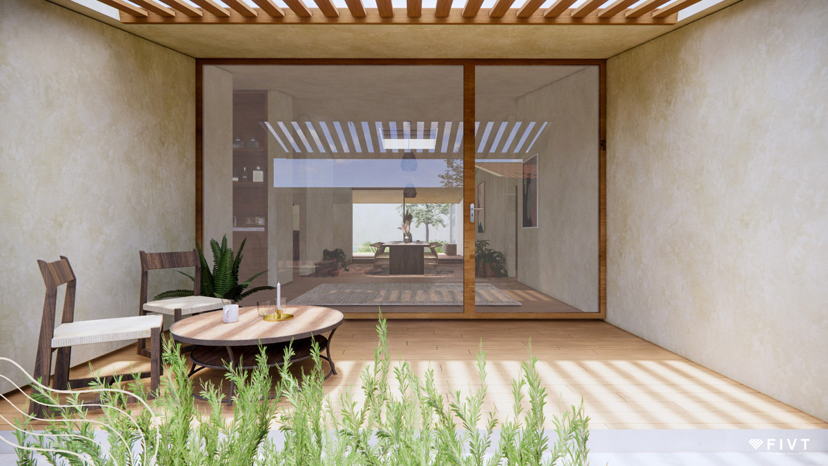 Al ingresar, un pórtico con acceso transparente permite que la luz y la vegetación se filtren, creando una transición suave desde el exterior hasta la terraza interior. Esta terraza, un espacio íntimo y acogedor, oculta su puerta en el muro, ofreciendo privacidad sin perder conexión con el entorno natural.