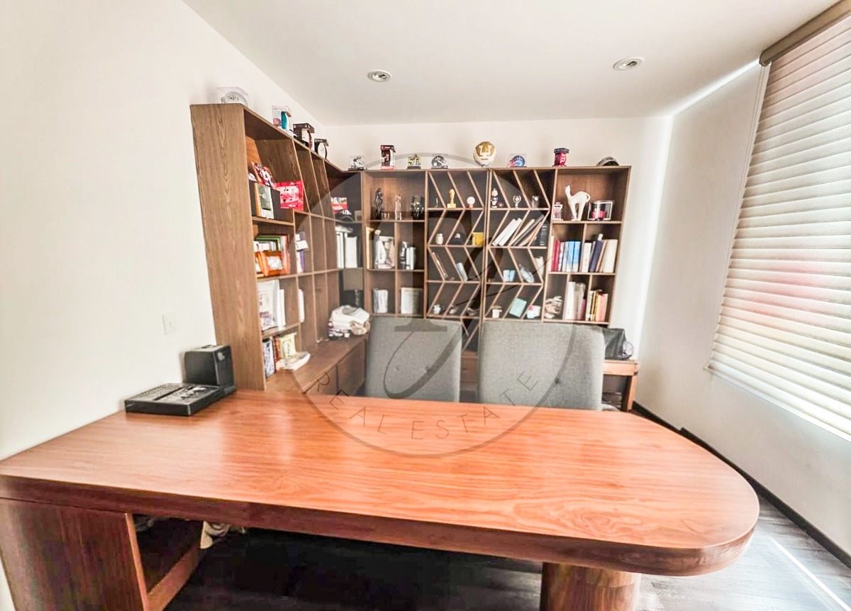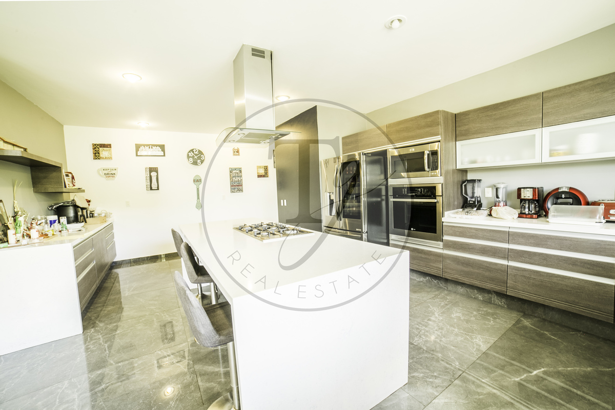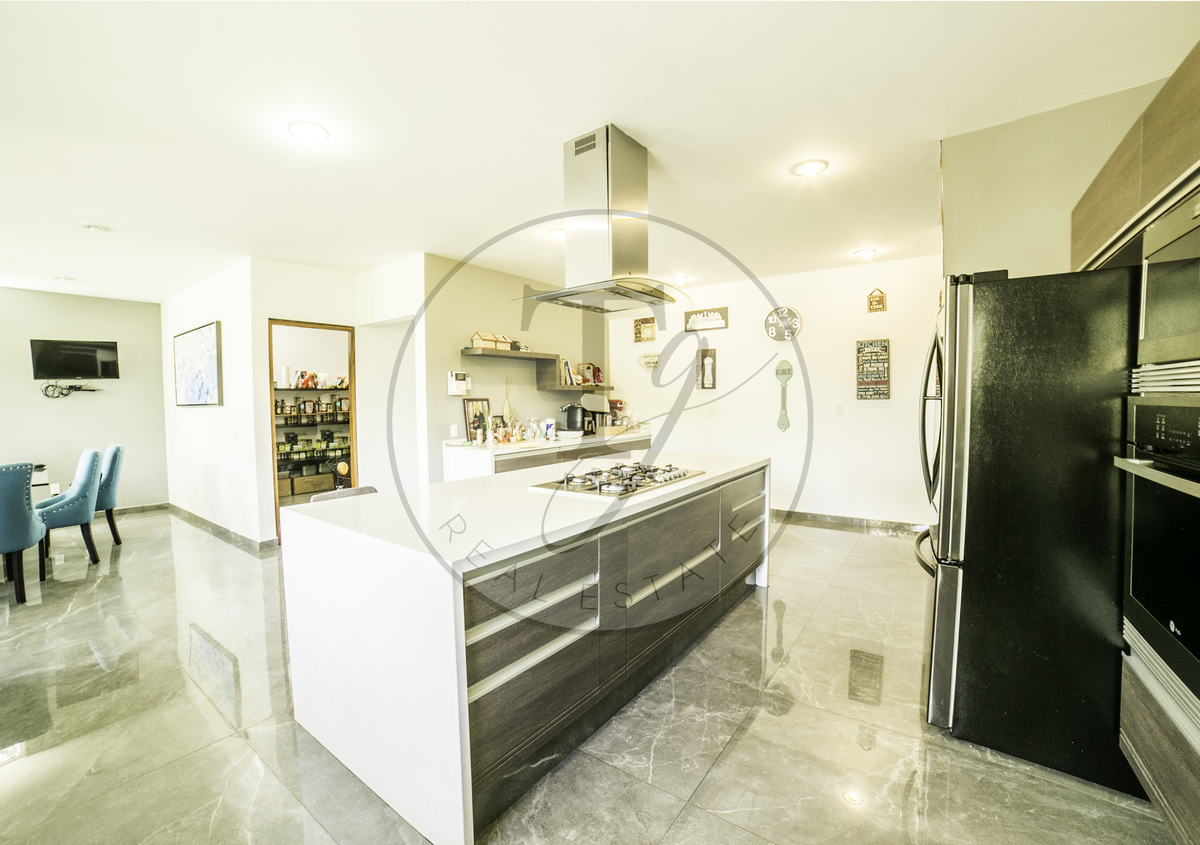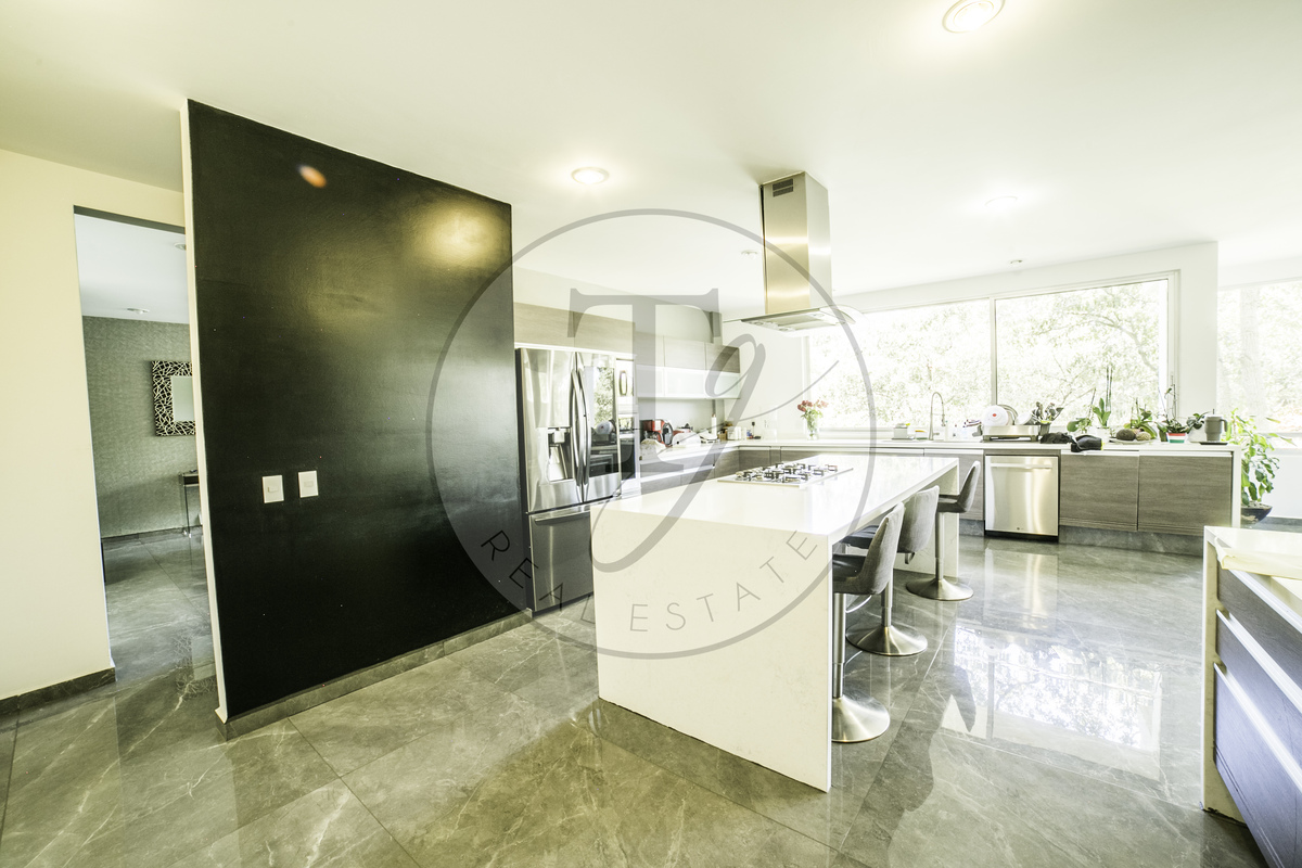 La cocina, con cubiertas de cuarzo blanco y vistas al bosque, es perfecta para los amantes de la gastronomía. En este nivel también se ubican un medio baño de visitas, una oficina y un cuarto de servicio con baño completo.
