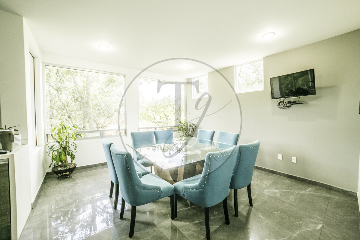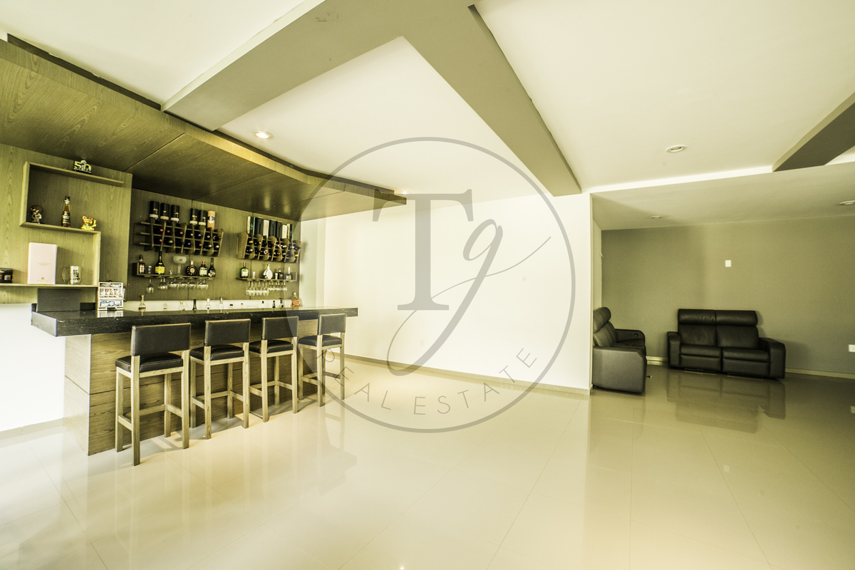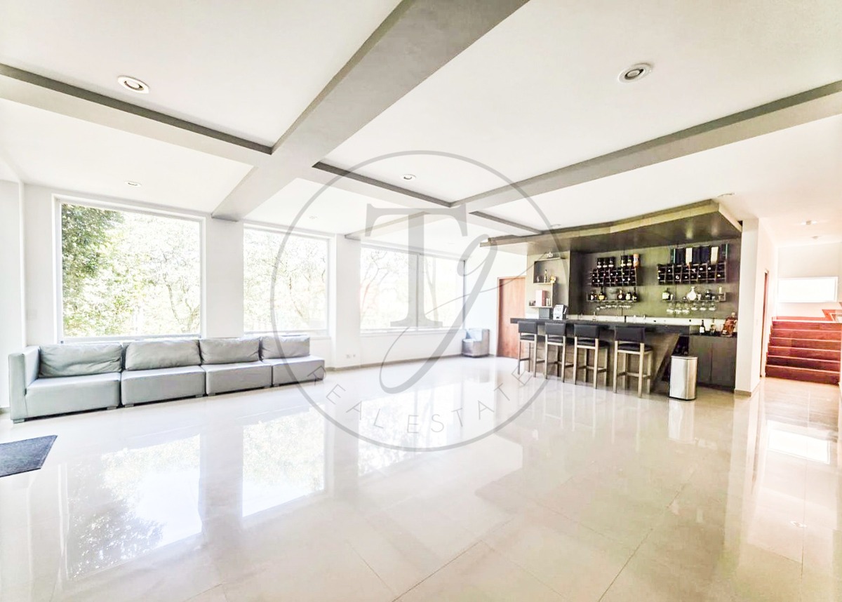 El nivel inferior ofrece un salón de eventos con barra y medio baño, además de acceso lateral independiente, ideal para reuniones y celebraciones.