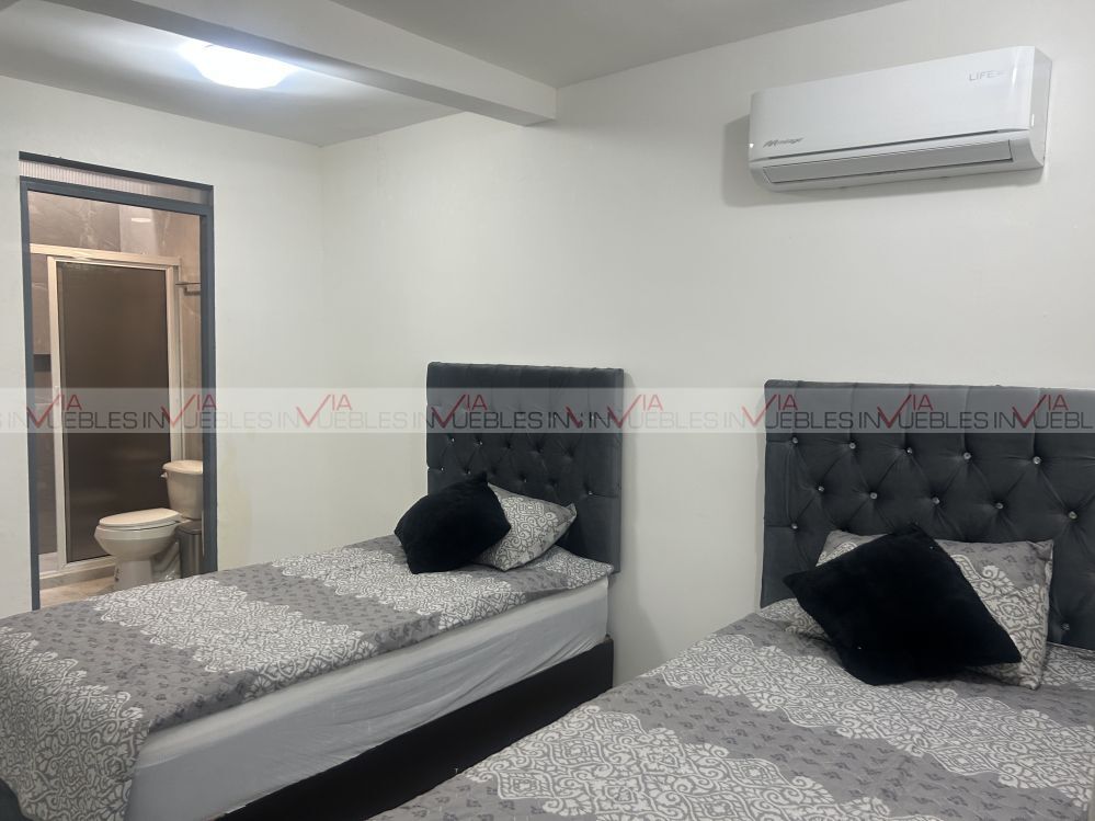 Bonita y equipada casa de un piso en renta en Guadalupe, N.L. muy cercana a HEB Av. Acapulco, cuenta con dos recamaras cada una con baño, sala comedor y cocina con estufa y electrodomésticos cuenta con cama Queen y dos individuales, cuenta con paneles solares y servicio de internet, una cochera sin techo.