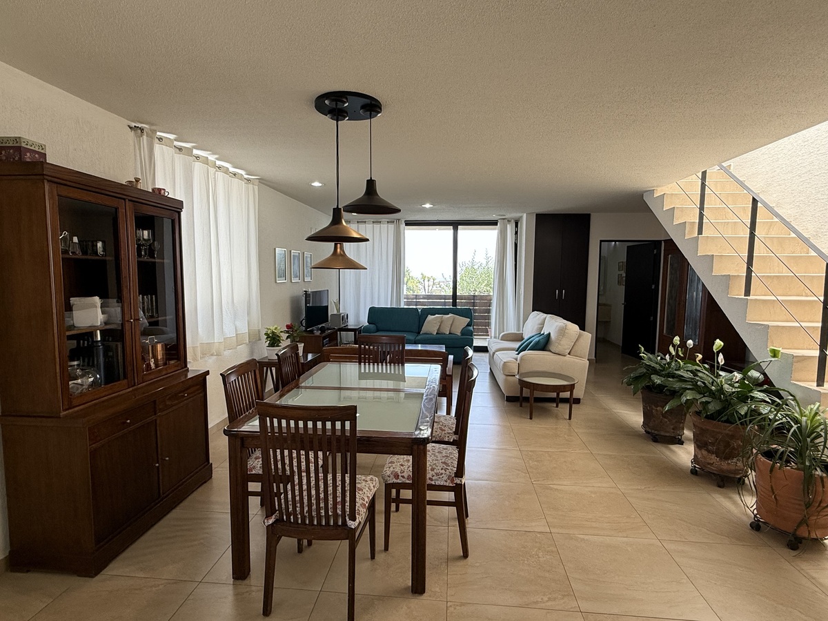 La habitación cuenta con baño privado y está completamente amueblada para tu confort. El departamento ofrece espacios comunes como una sala-comedor, cocina equipada y una terraza perfecta para relajarte o disfrutar de la vista.