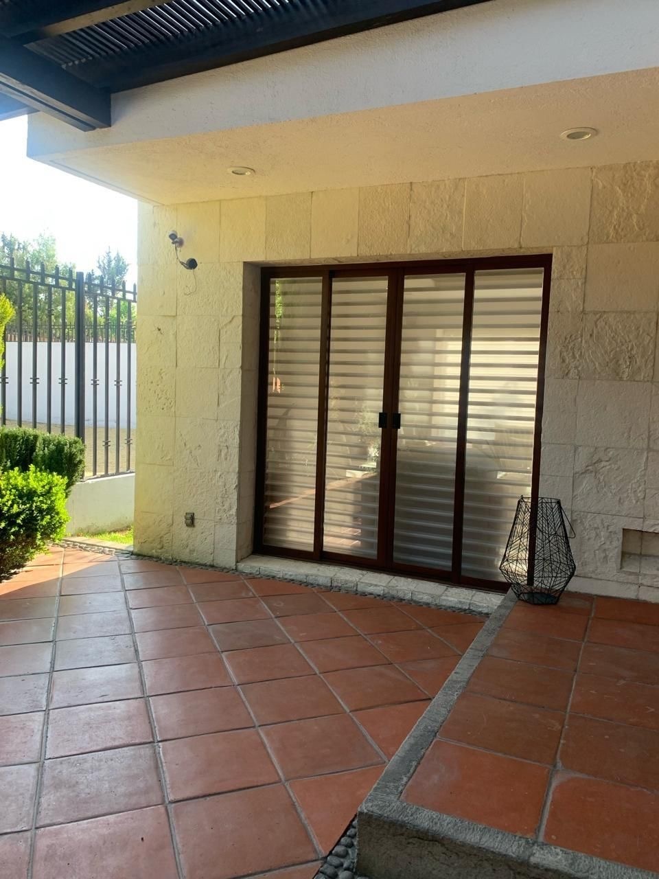 de encino y cristal templado, pisos cerámicos en área de comida y comedor, cancel de división para ambos servicios, pasta y yeso sobre muros, ventanas en aluminio español color madera, estacionamiento con piso de concreto, piedra bolada y adocreto y bomba de agua