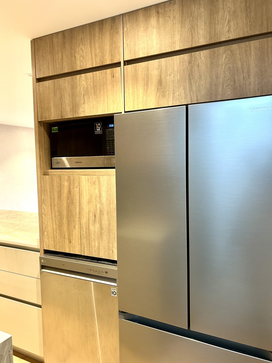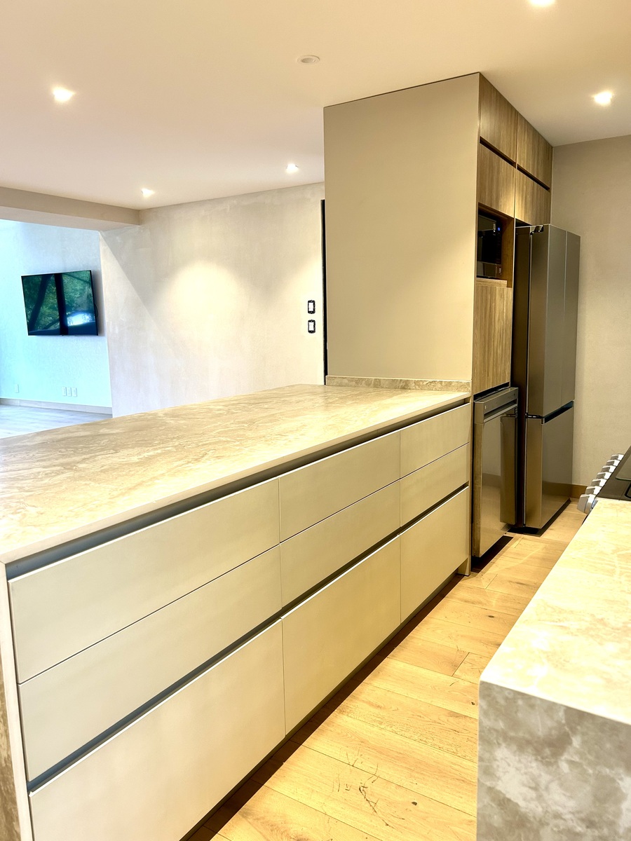 Amplia estancia con saliva al balcón, cocina abierta con electrodomésticos y barra al comedor, medio baño de visitas.