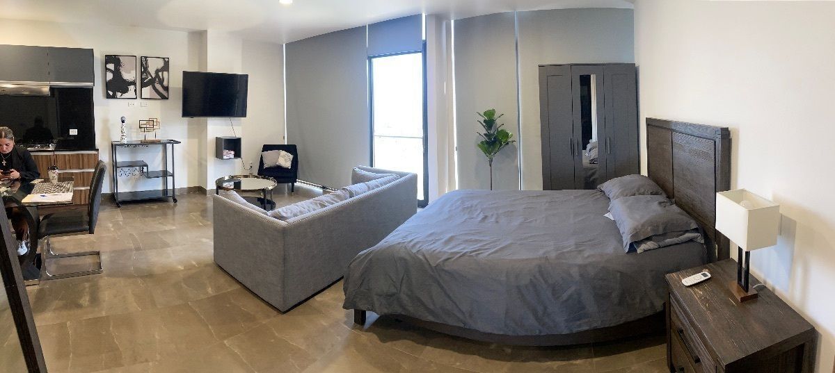 Es un estudio completamente amueblado , cama , 2 closets , baño completo, área de sala comedor con TV , cocina completamente equipada y cuarto de lavado.