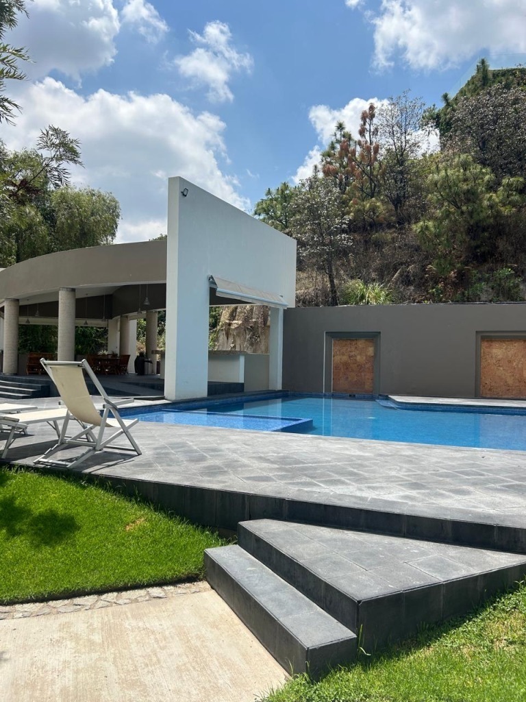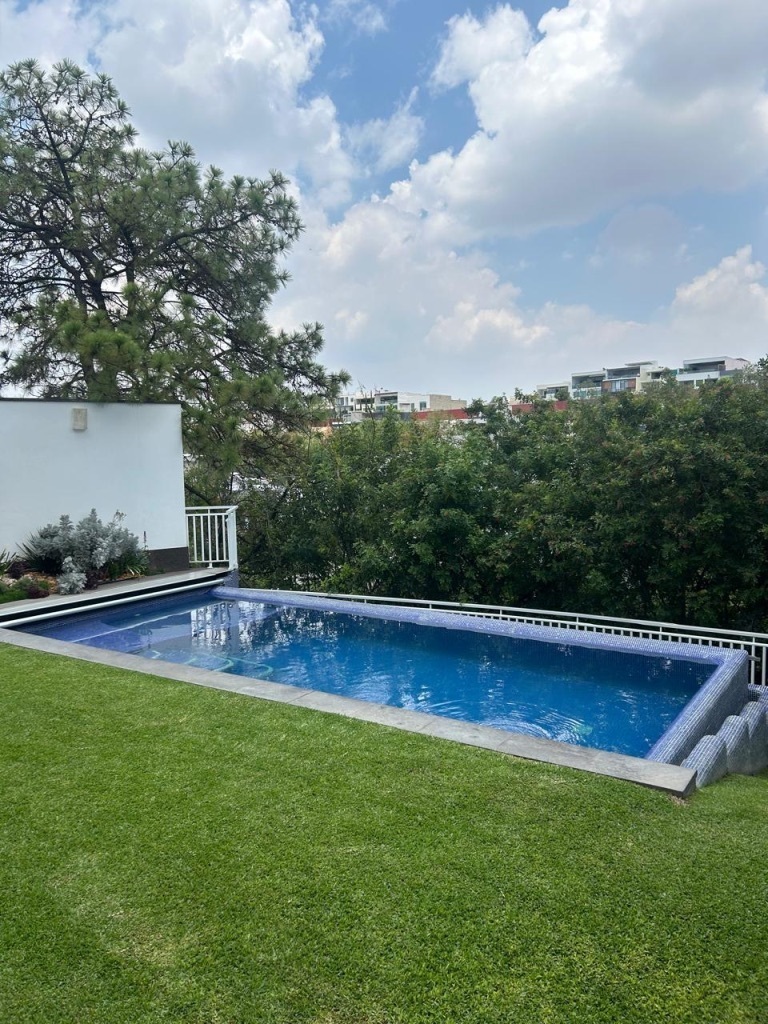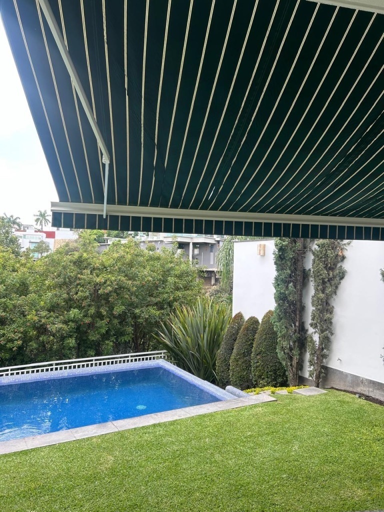 Terraza techada con antecomedor, con techo extraíble de tela, alberca con cubierta eléctrica, regadera junto a alberca. Jardin, baño para el área de Jardin, cuarto bodega.
