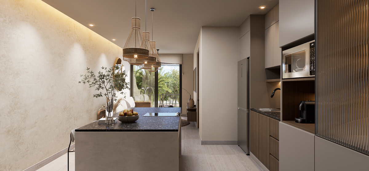 Todos los departamentos están equipados con cocinas modernas con barra de granito y parrilla eléctrica, además de un espacio para lavasecadora.
