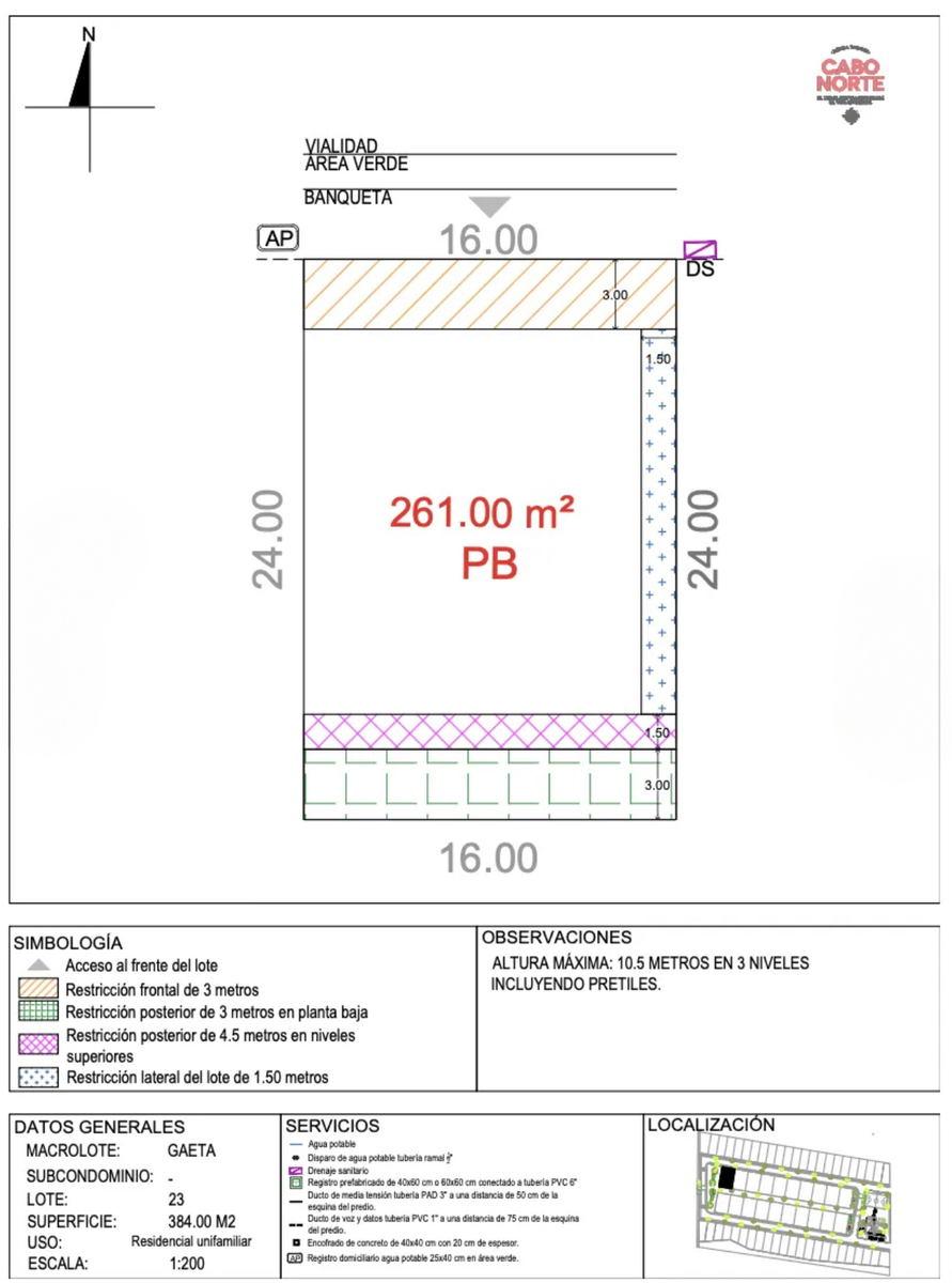 Este lote se encuentra dentro de Privada Gaeta, una comunidad cerrada de lujo que forma parte de la segunda etapa de Cabo Norte. Aquí disfrutarás de privacidad, vigilancia 24/7, calles amplias y arboladas, y un entorno moderno con acceso a una amplia gama de amenidades, ideales para vivir o invertir.