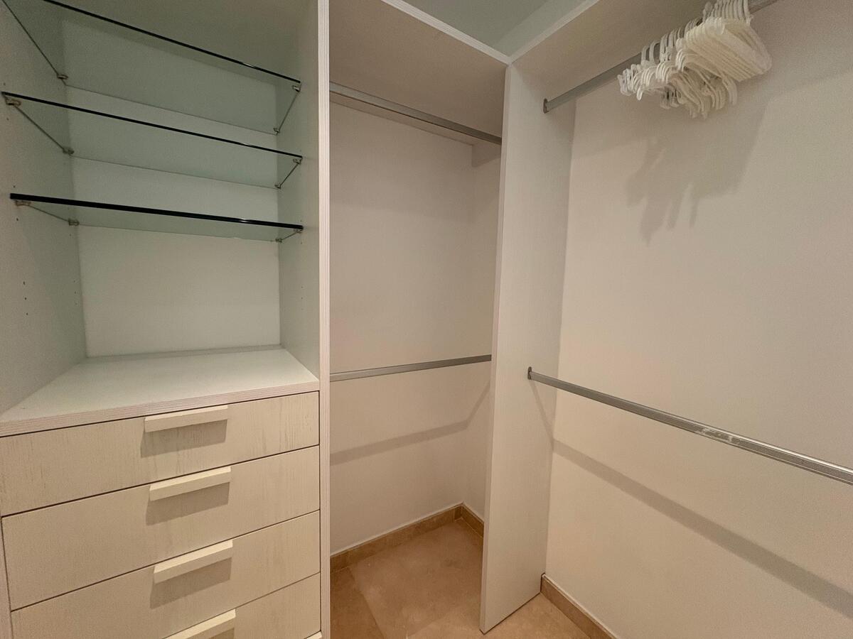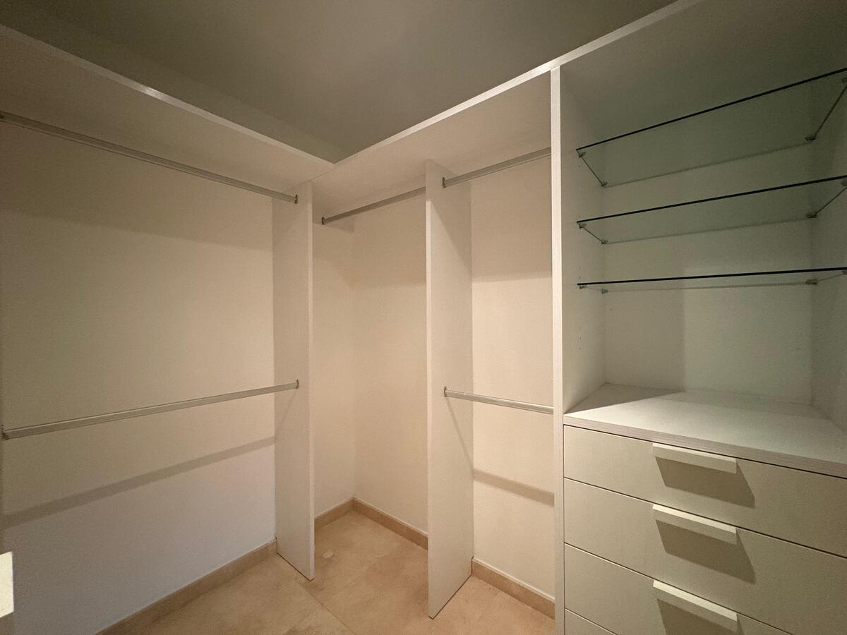 Recámara principal con closet vestidor y baño completo privado, cama king size con buros