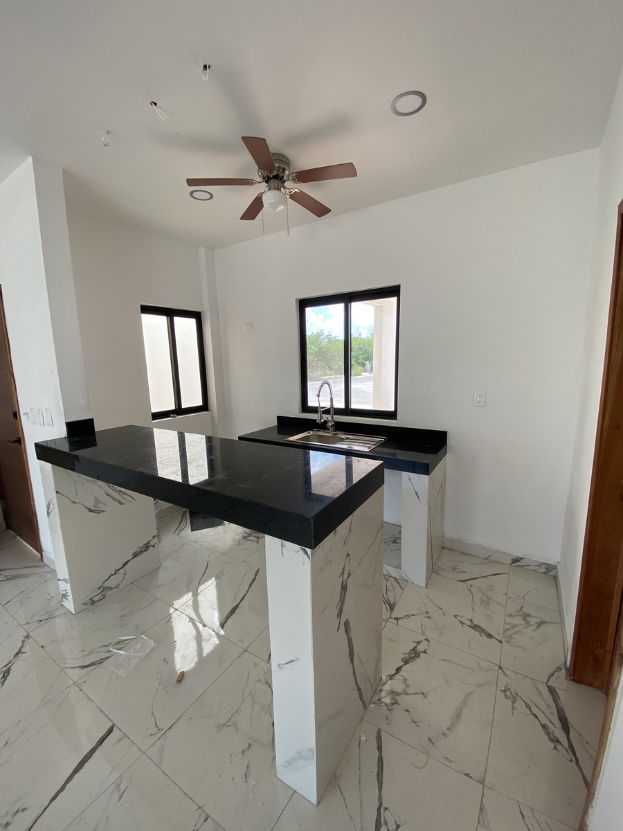 - Cocina con meseta de granito, ventilador y lampara decorativa.
