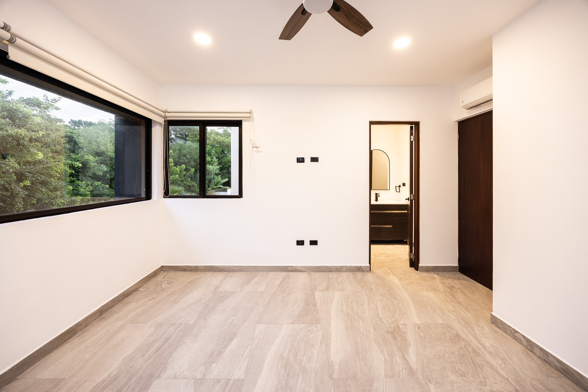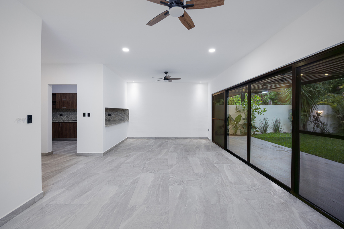 Su distribución aprovecha la luz natural y la ventilación cruzada, integrando las áreas sociales con el jardín y la piscina privada.