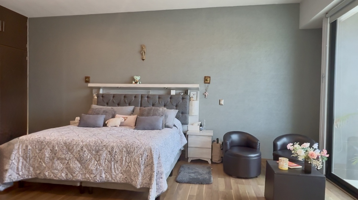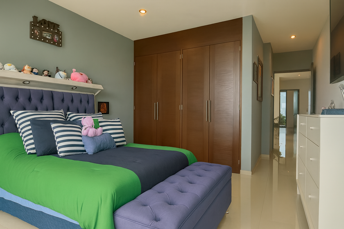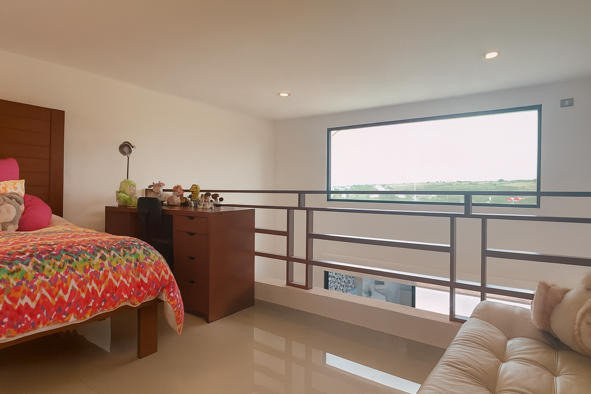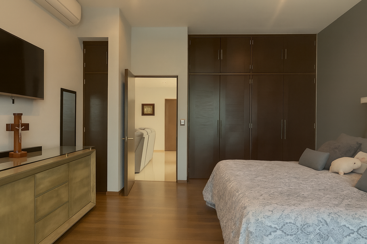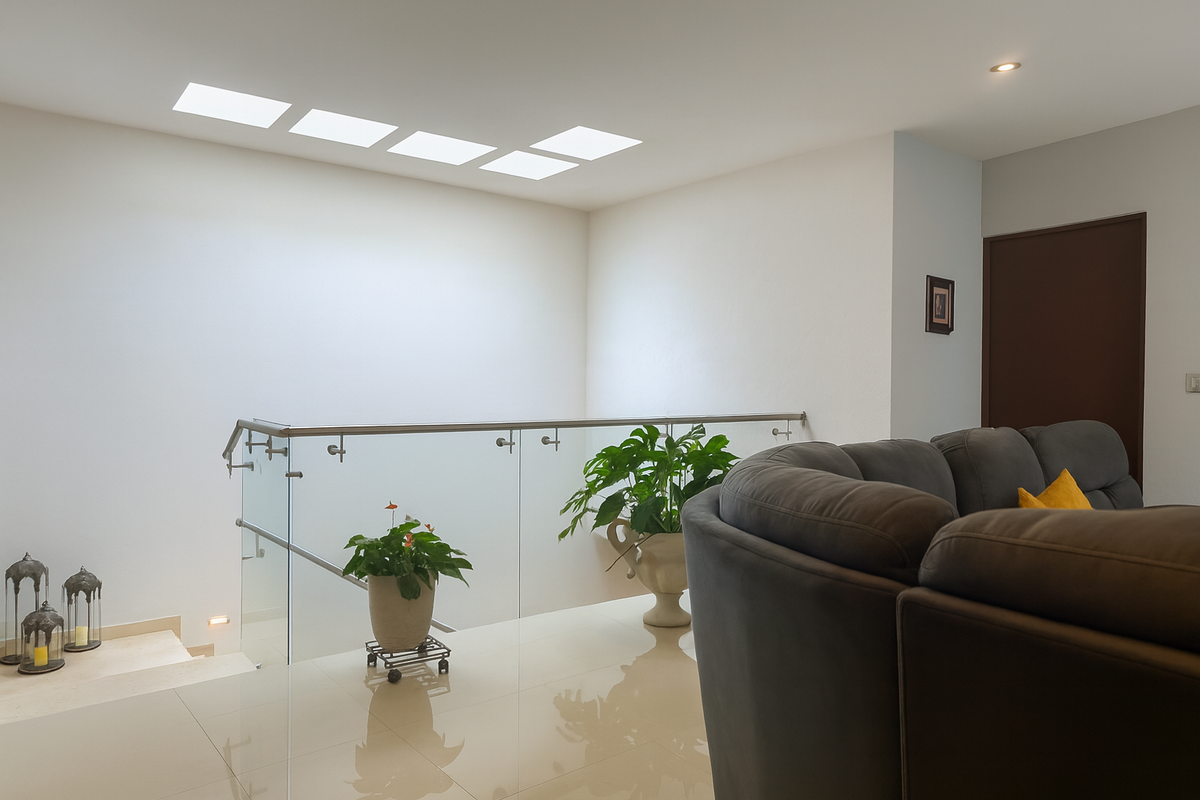 En la planta alta, la sala de TV familiar conecta con tres habitaciones, cada una con baño completo recubierto de mármol. Dos de las recámaras secundarias tienen capacidad para cama King Size, y una de ellas cuenta con altura y media y tapanco con salida a la azotea. La habitación principal, de gran tamaño, ofrece vestidor, clóset adicional y baño con jacuzzi para dos personas, área de WC independiente y acabados en mármol.