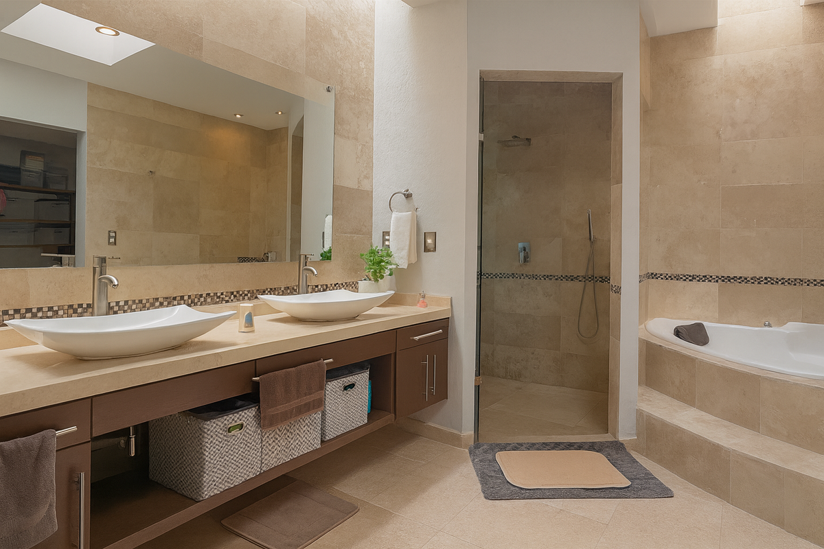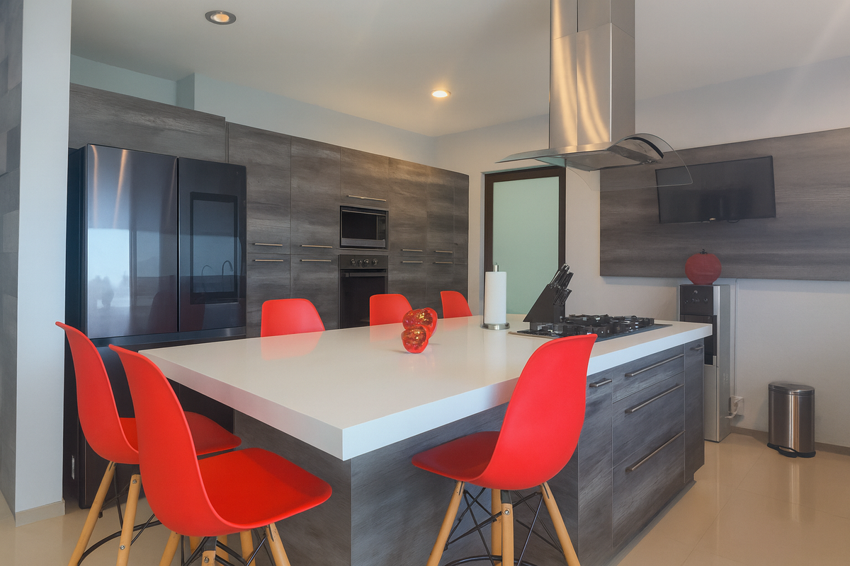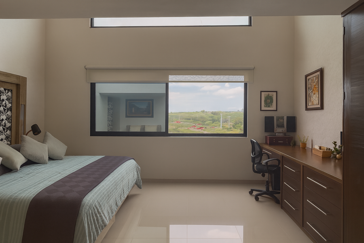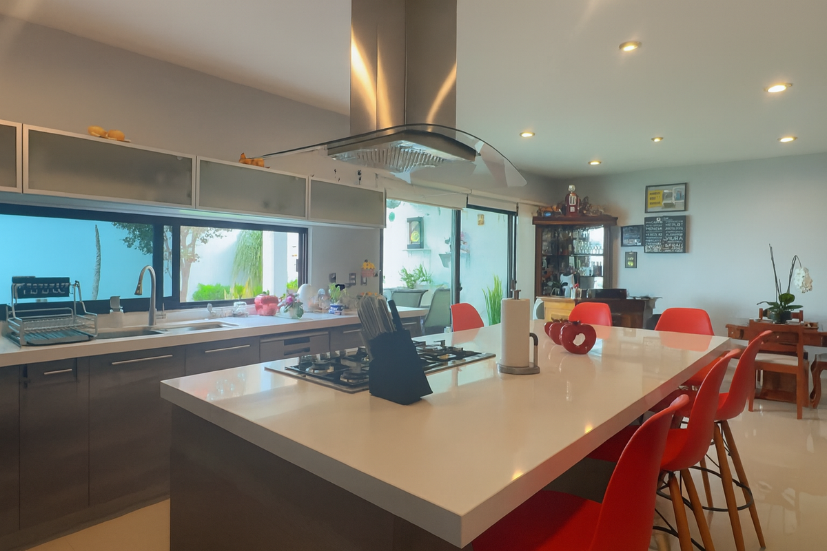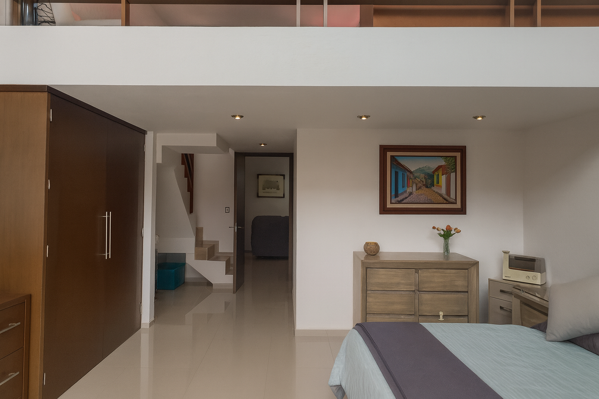 En la planta alta, la sala de TV familiar conecta con tres habitaciones, cada una con baño completo recubierto de mármol. Dos de las recámaras secundarias tienen capacidad para cama King Size, y una de ellas cuenta con altura y media y tapanco con salida a la azotea. La habitación principal, de gran tamaño, ofrece vestidor, clóset adicional y baño con jacuzzi para dos personas, área de WC independiente y acabados en mármol.