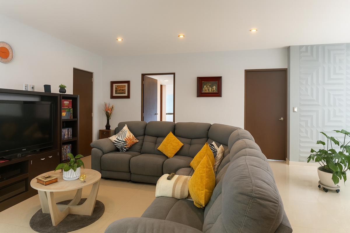 Al llegar, te recibe un portón eléctrico y tres lugares de estacionamiento totalmente techados y seguridad reforzada. Un vestíbulo con clóset de blancos da paso a una sala iluminada por un gran ventanal, un medio baño y un estudio con acceso directo al pasillo lateral.