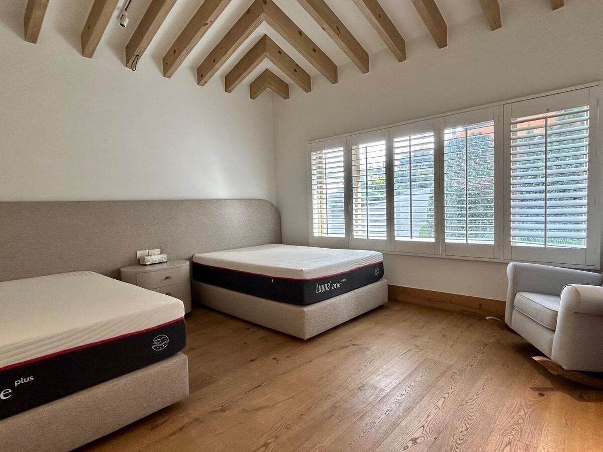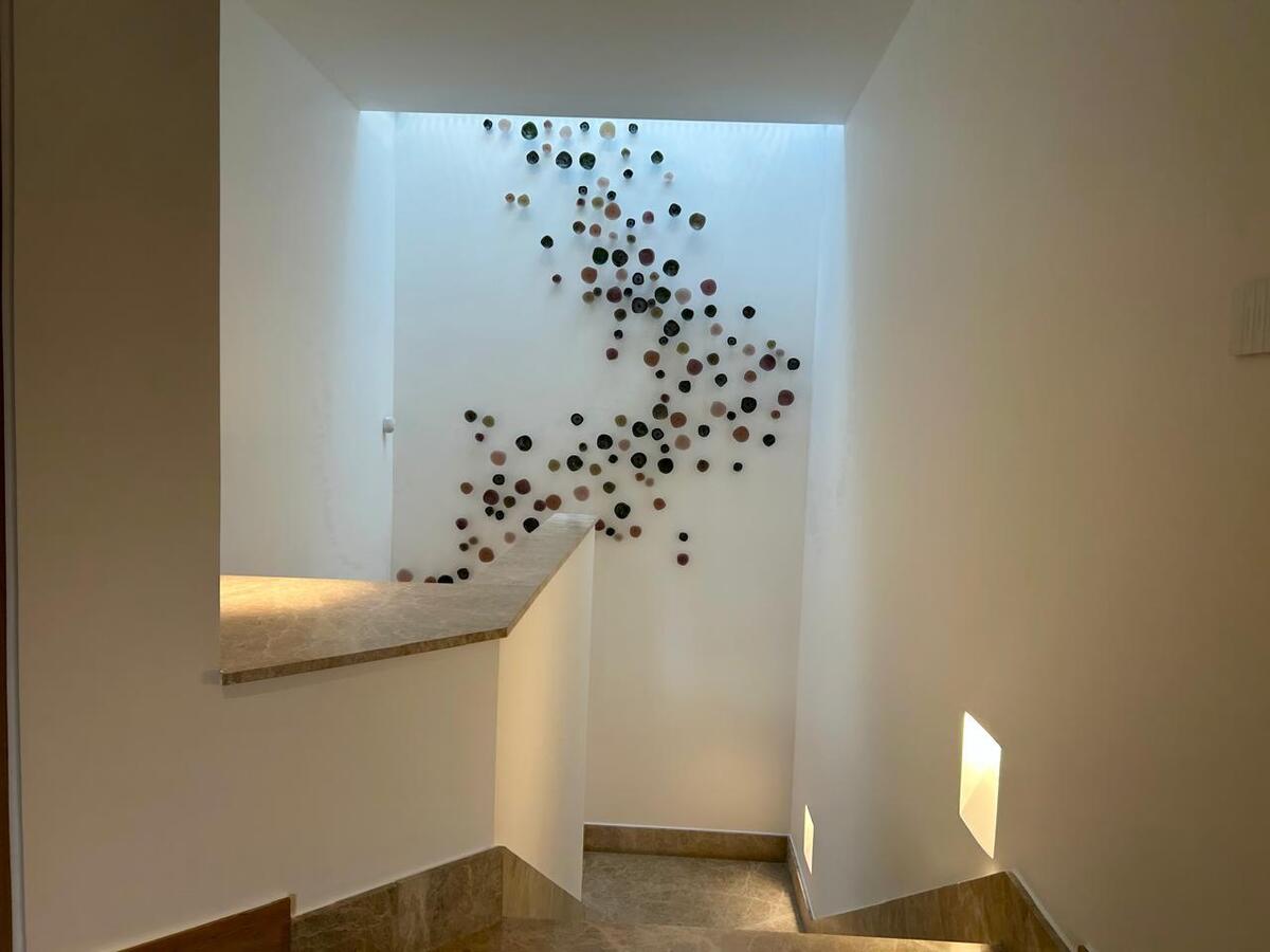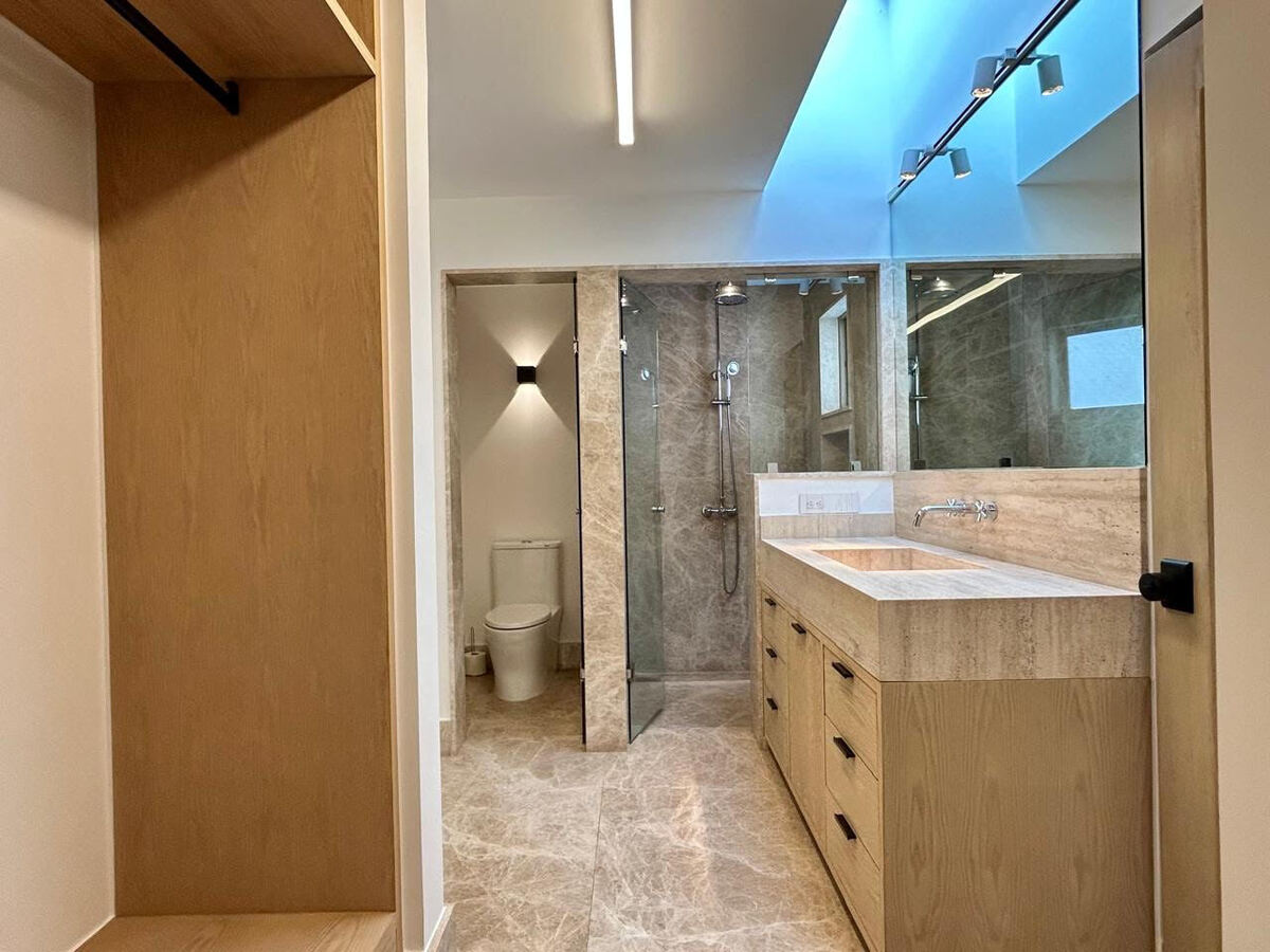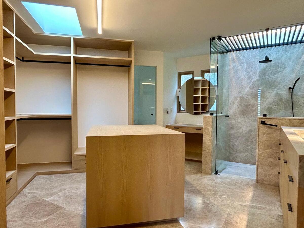 En la planta alta los pisos son de madera, con 3 recámaras, cada una con vestidor y baño completo, integradas por un family room central. La casa dispone de 3 lugares de estacionamiento, cuarto de servicio, lavandería y bodega.