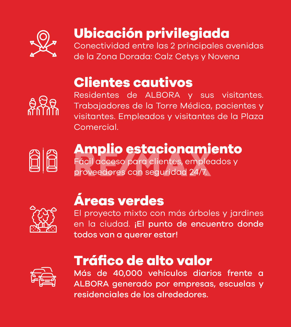 Plaza Albora ofrece locales comerciales con diseño moderno, excelente ubicación y alto flujo vehicular, ideales para giros como oficinas, cafeterías, restaurantes boutique, consultorios o servicios profesionales.