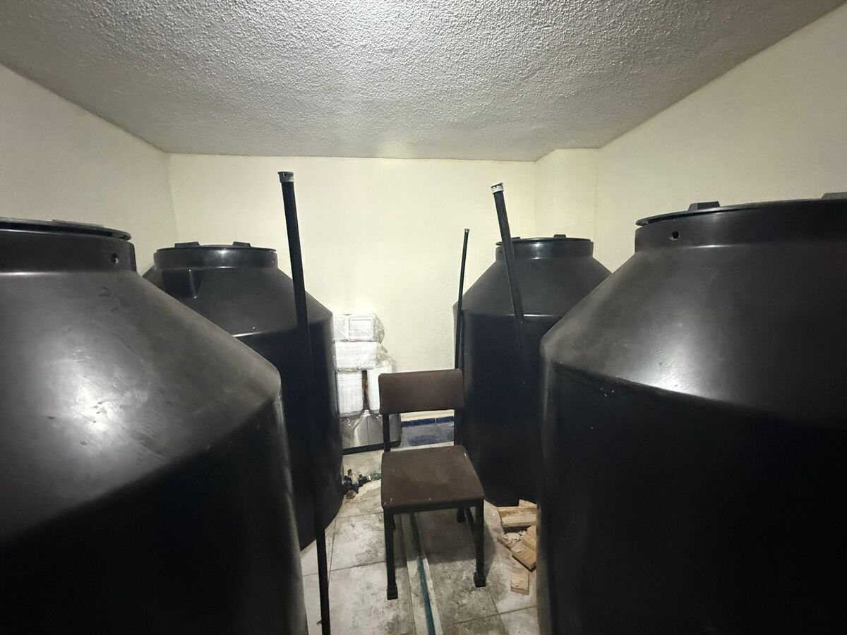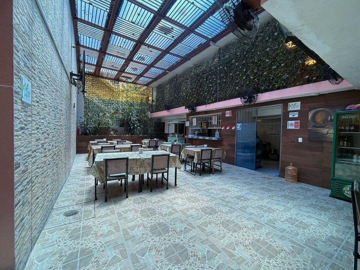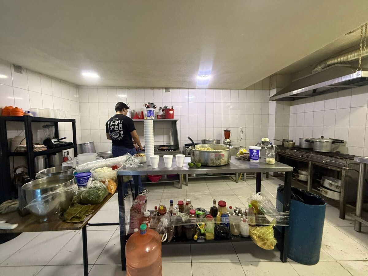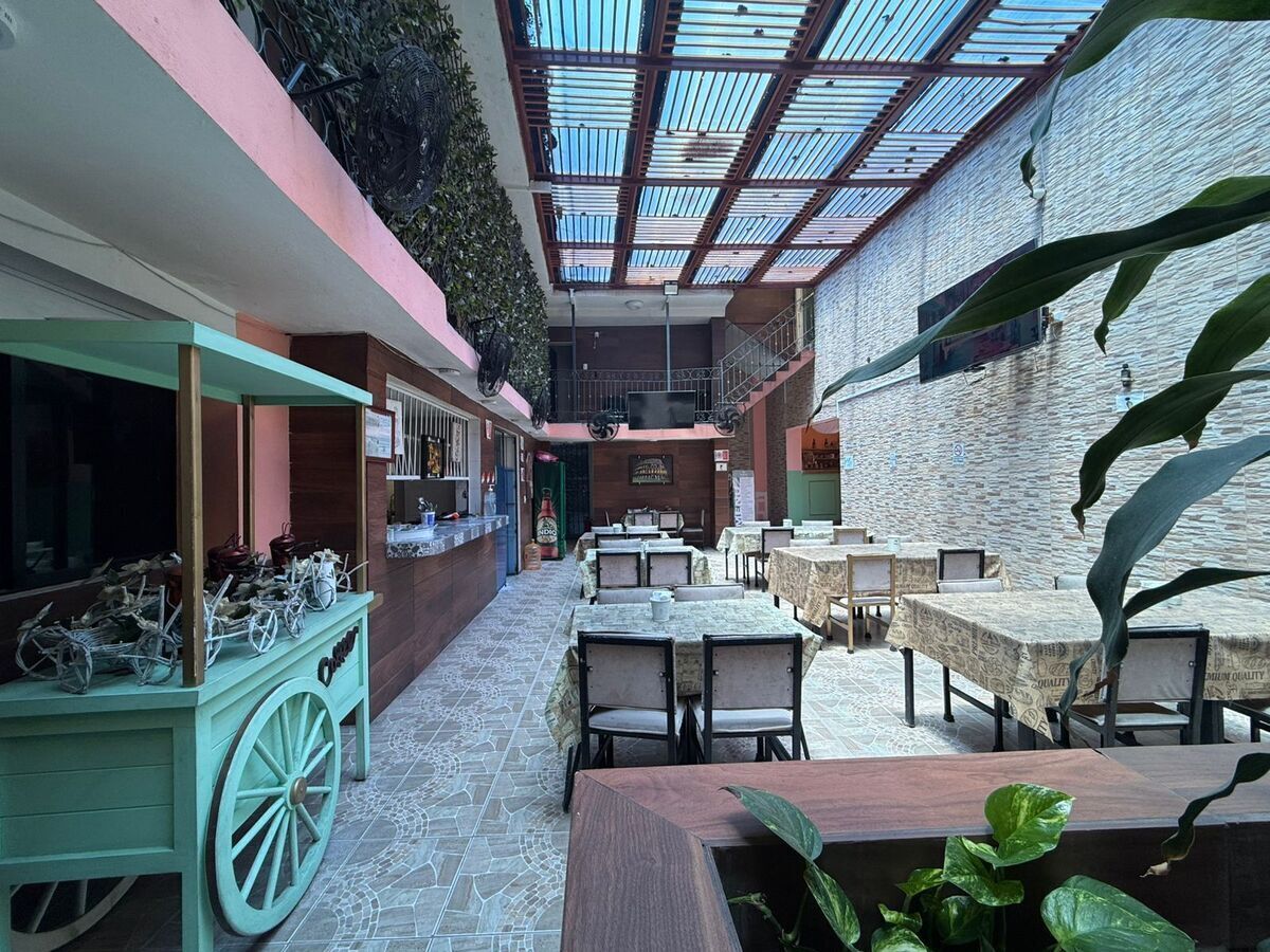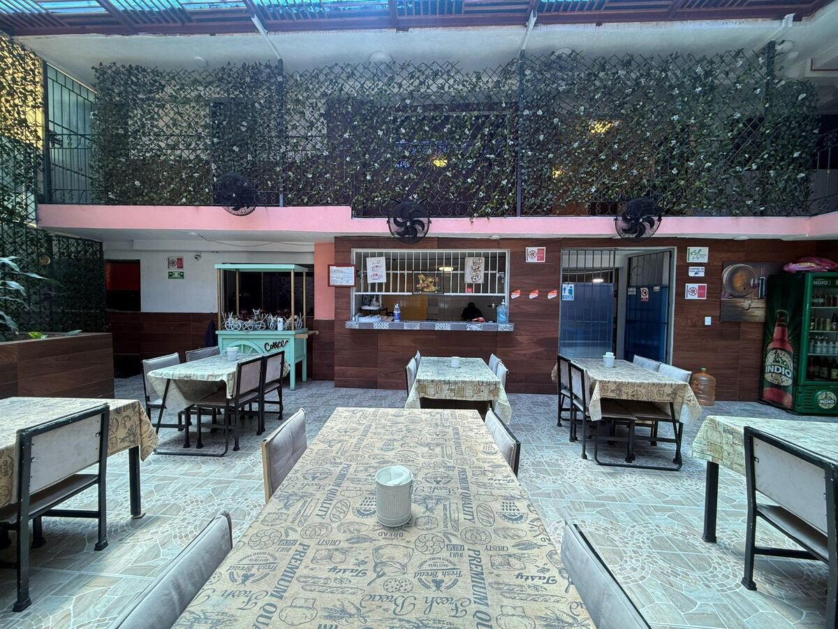 Un área abierta para mesas y atención al público, la cocina, bodega y un área con 5 tinacos de agua .