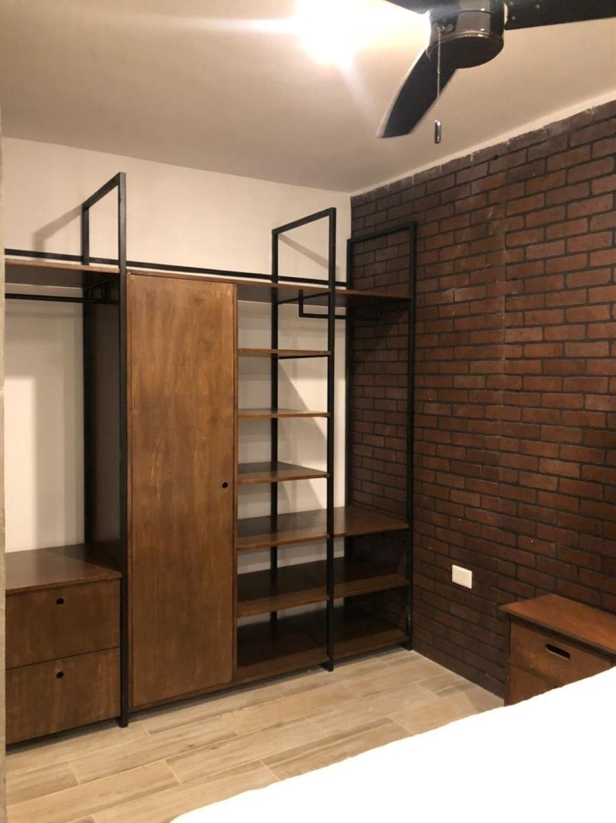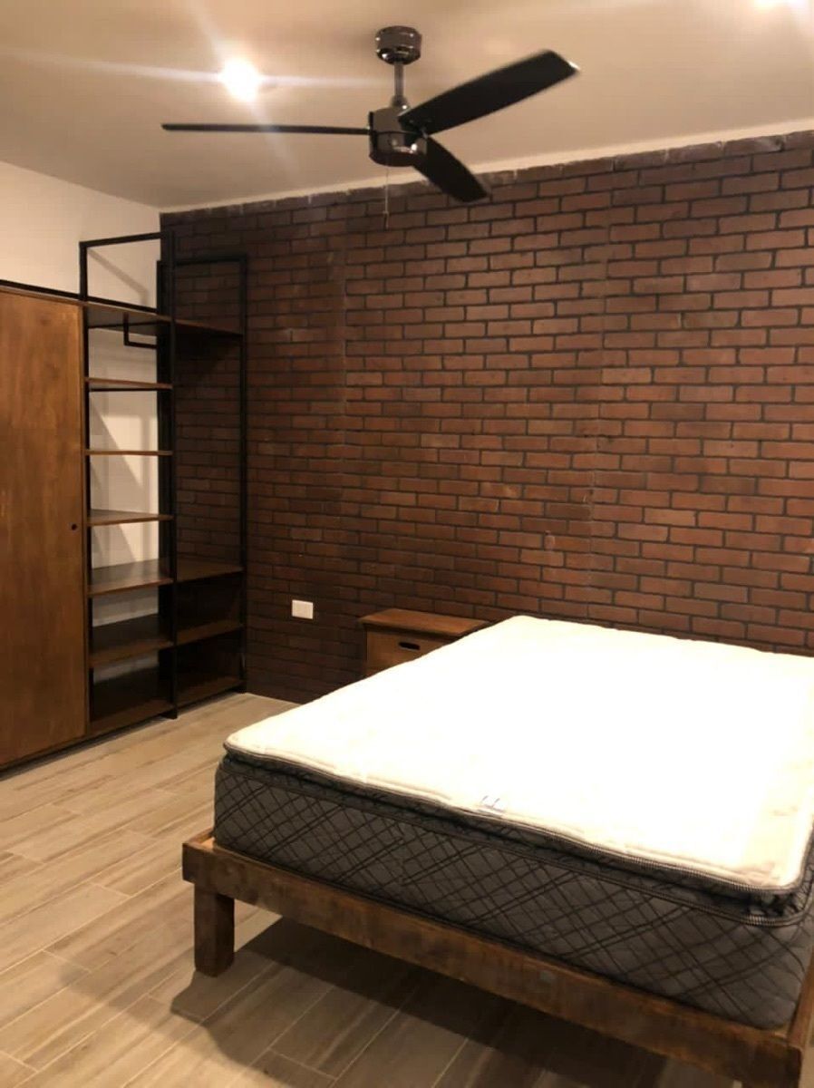 1 dormitorio con AC que enfría todo el departamento, ventilador de techo, cajoneras de closet de madera para 1 persona o 2 minimalistas.