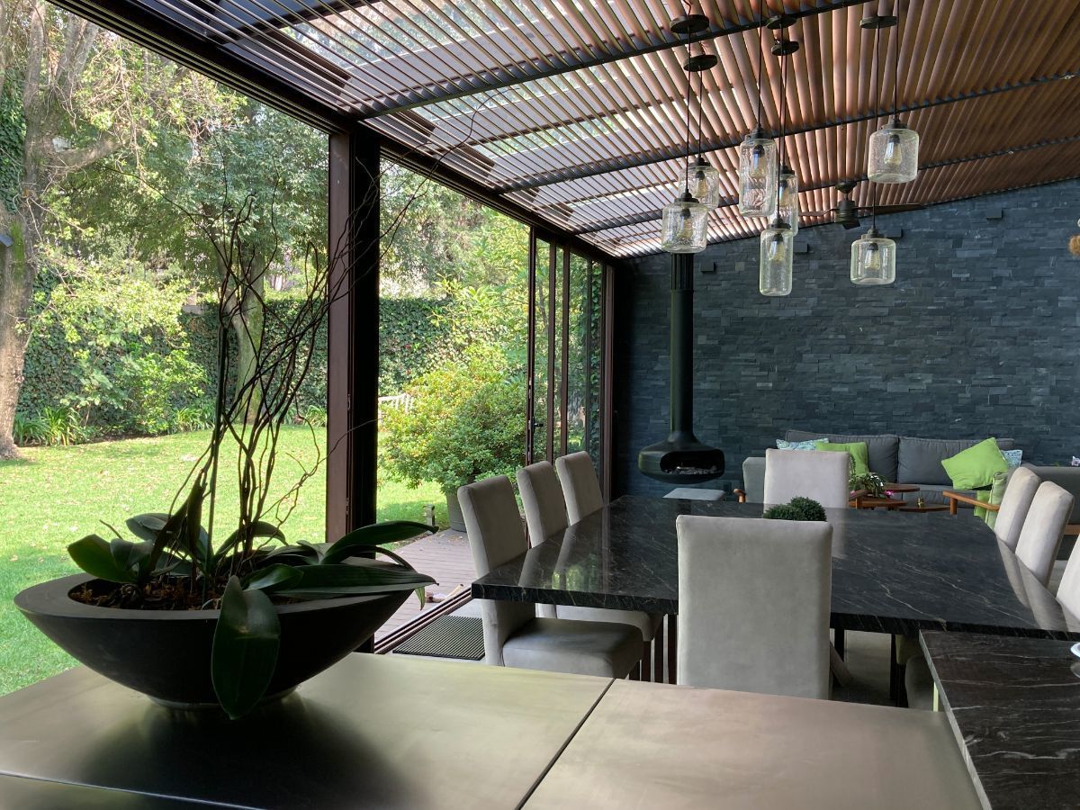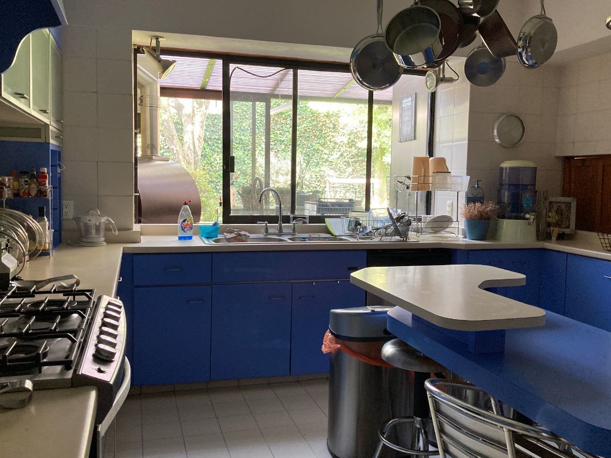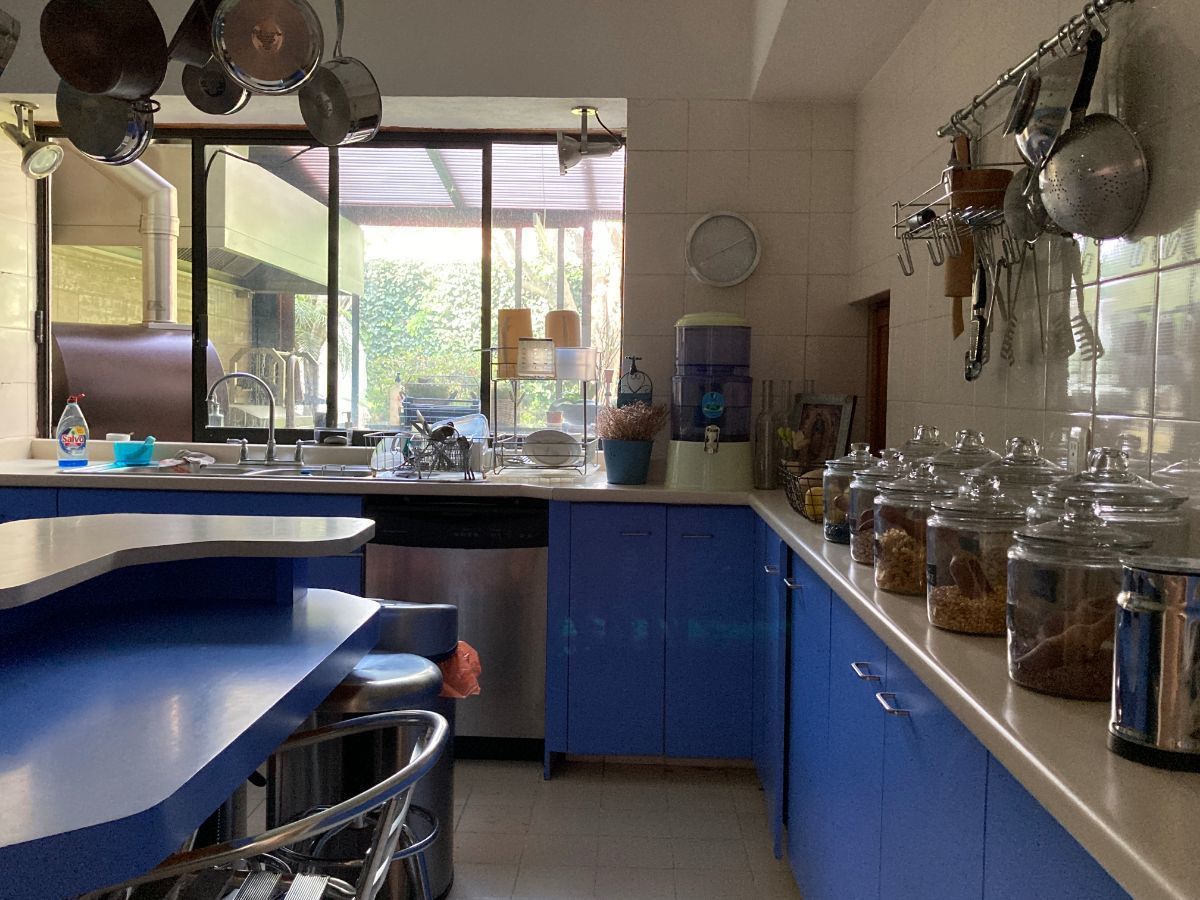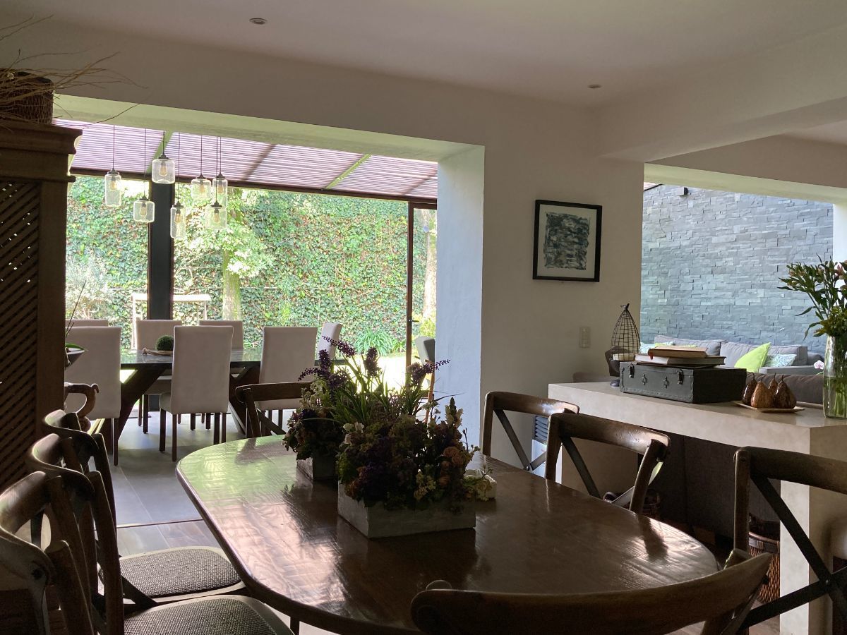 En planta baja tenemos sala y biblioteca con un muro llorón. Cuenta con dos cocinas, una de ellas para el uso diario y la otra está proyectada junto al jardín y al comedor, IDEAL para reuniones.
