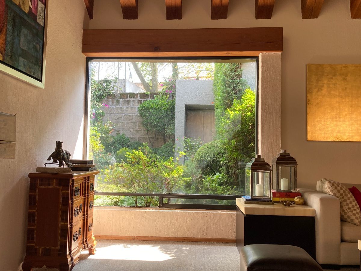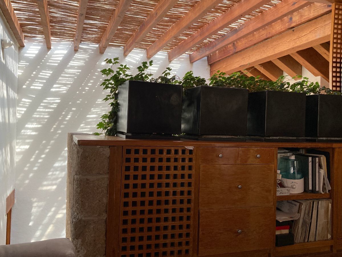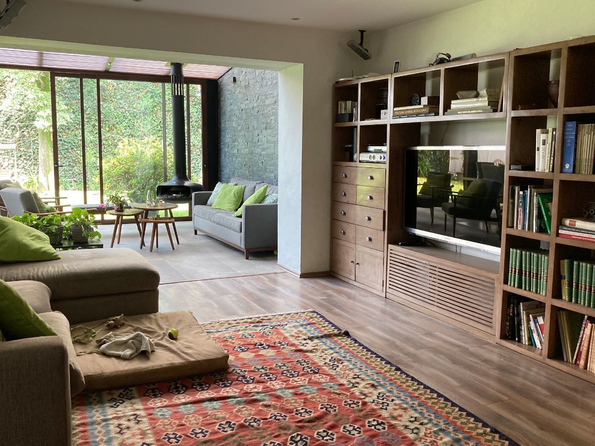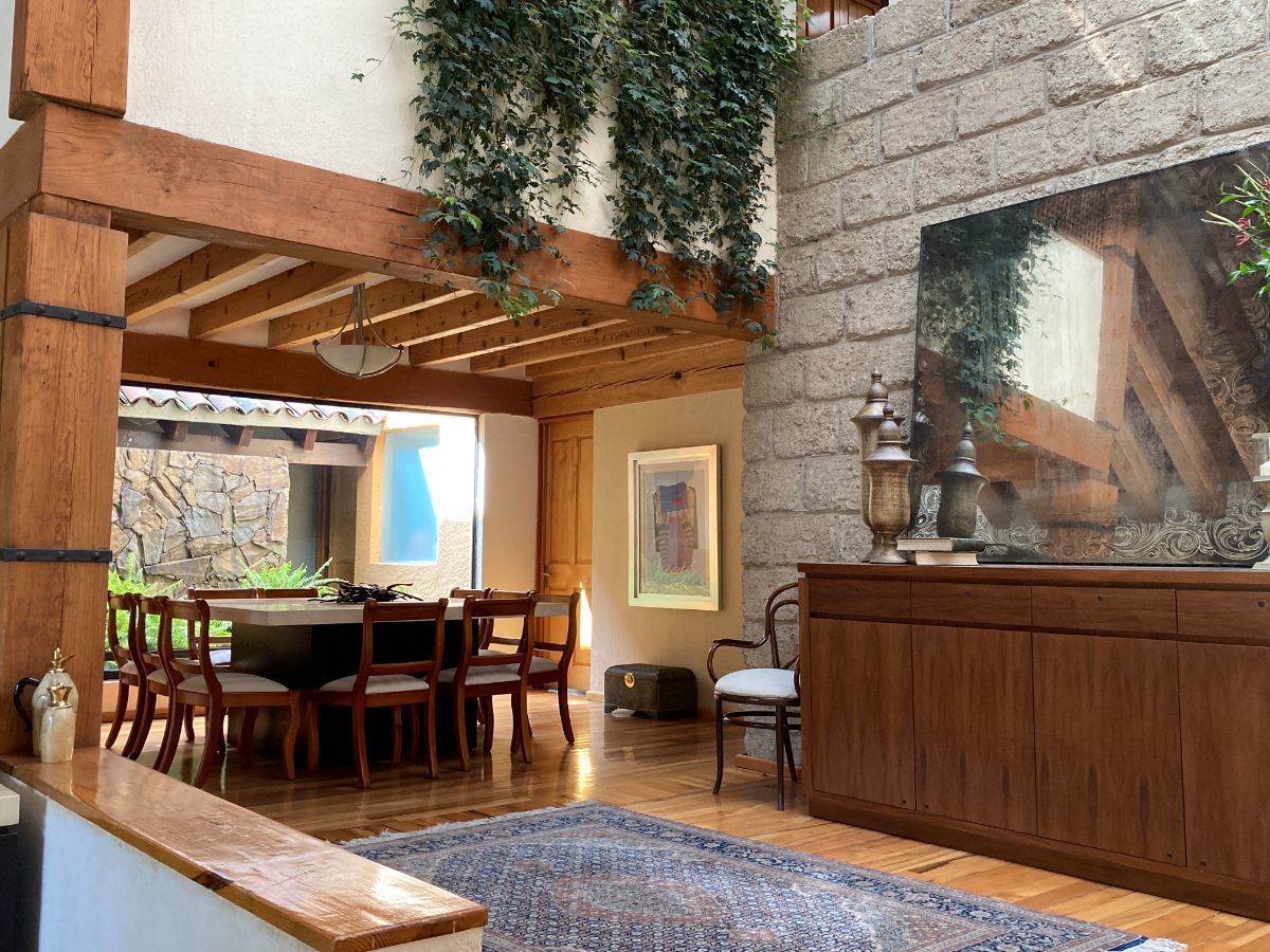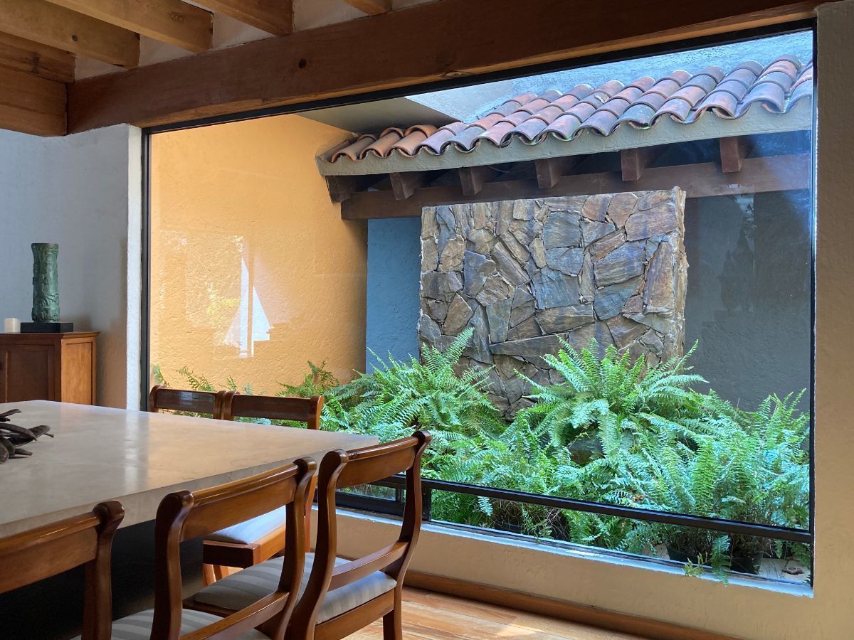 En planta baja tenemos sala y biblioteca con un muro llorón. Cuenta con dos cocinas, una de ellas para el uso diario y la otra está proyectada junto al jardín y al comedor, IDEAL para reuniones.