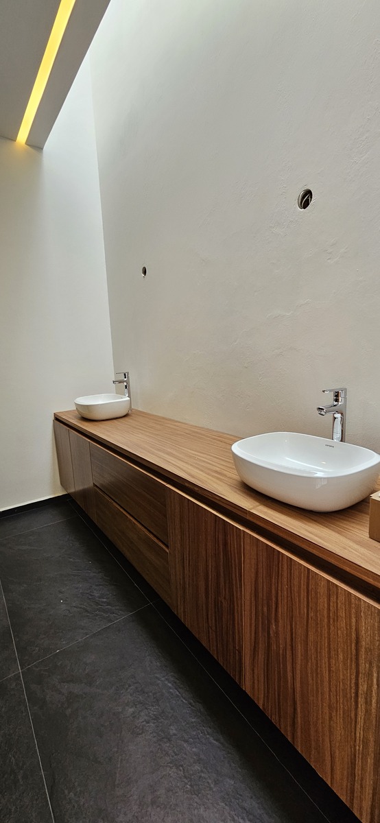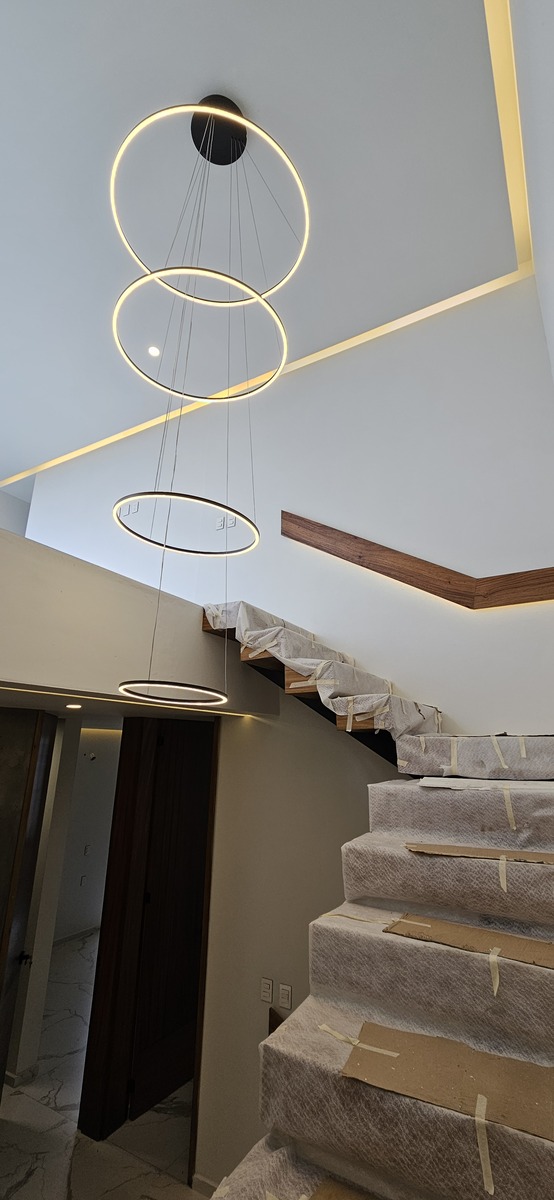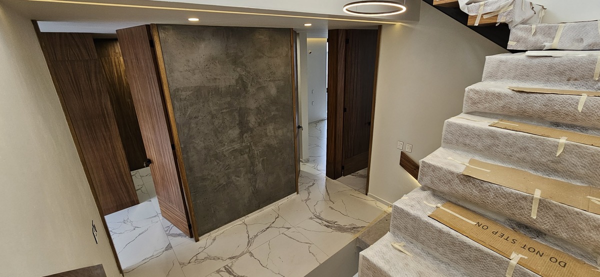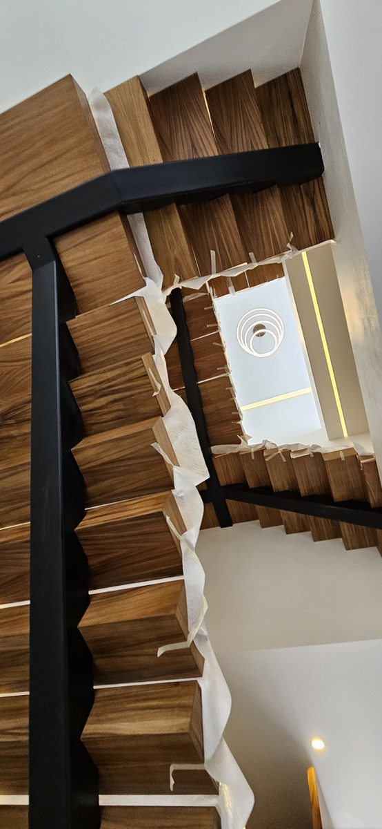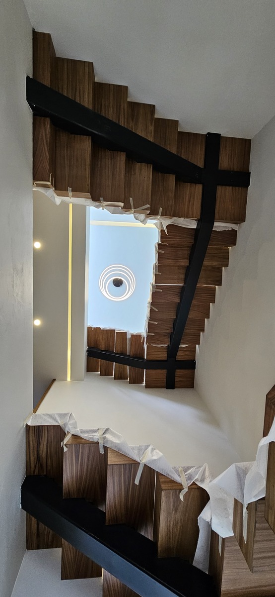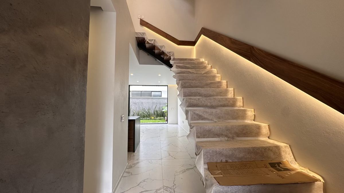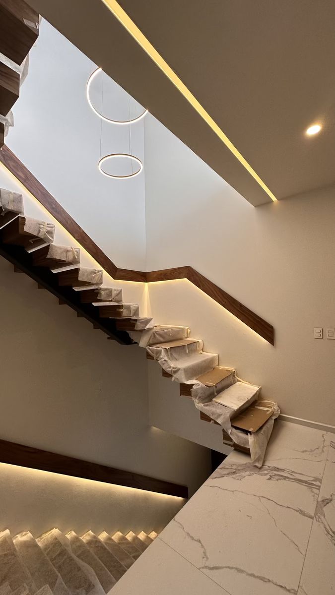 Escaleras semi flotantes forradas de madera de parota con pasa manos de madera con iluminación indirecta que da un toque de elegancia y seguridad extra.