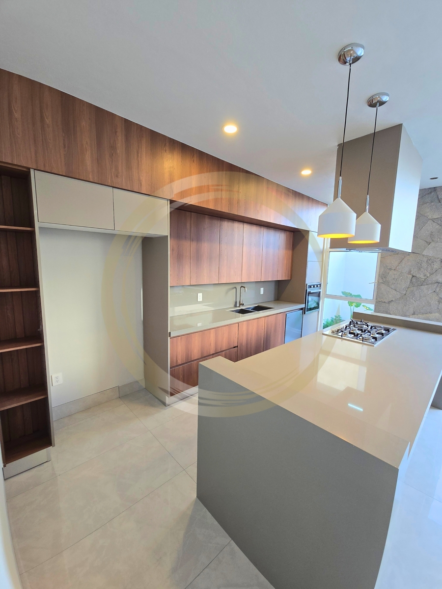 La cocina es el corazón del hogar, equipada con barra de cuarzo, isla central y carpintería en chapa de nogal.