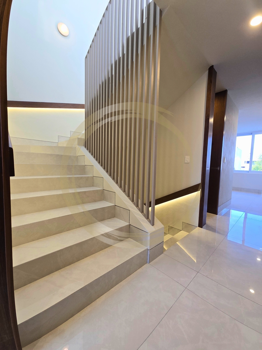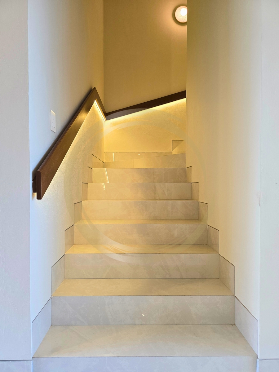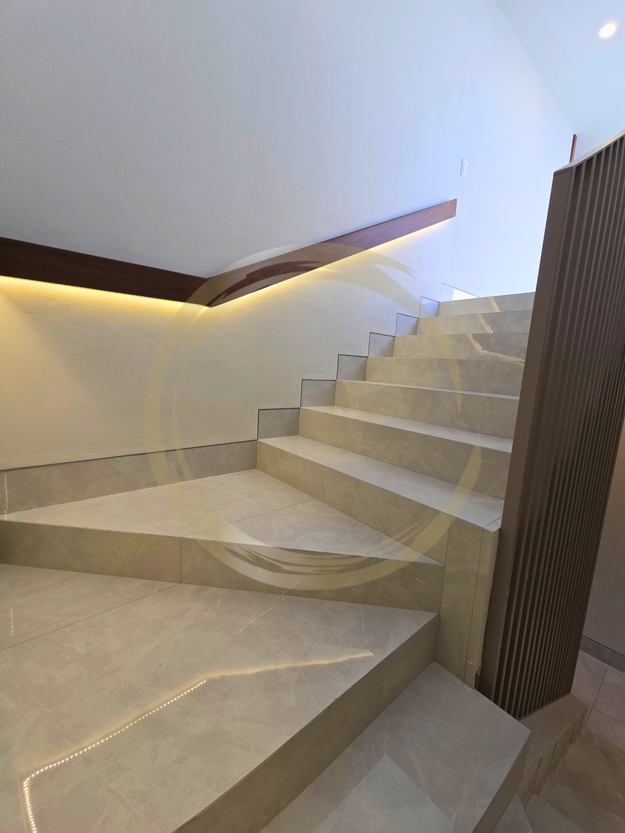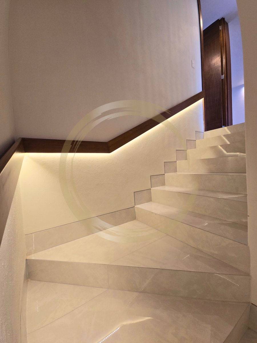 Iluminación: Escaleras de diseño con iluminación LED indirecta, potenciando la sensación de lujo.