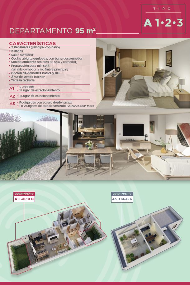 6 prototipos de depas de 2 y 3 recámaras. Con o sin Jardín o con o sin Roof Garden.