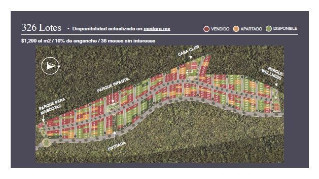 dentro de un complejo residencial de 5 privadas llamada Alement. Mintara cuenta de 326 lotes desde 280m2 de superficie hasta 500m2, distribuidos en pequeños clusters de pocas unidades habitacionales articulados por una avenida principal y 4 parques distribuidos a lo largo del desarrollo.