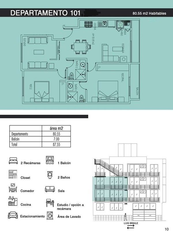 La propiedad cuenta con una superficie de 80.55 m², distribuidos en dos recámaras, dos baños completos, sala-comedor, cocina, un estudio con posibilidad de adaptarse como tercera recámara, y un balcón de 7 m². Incluye un cajón de estacionamiento.