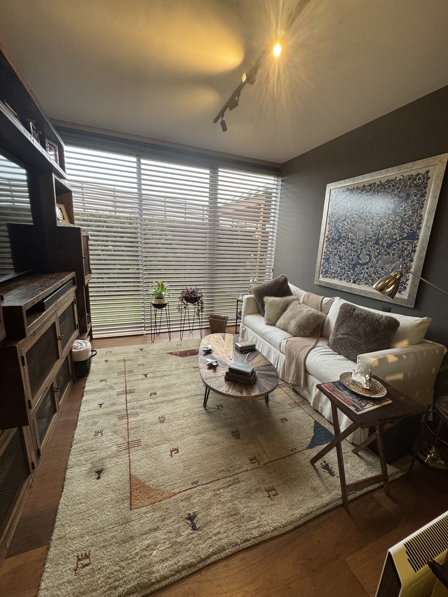 Todo el departamento da a una terraza con pérgola y asador muy bonitos. Y jardín.