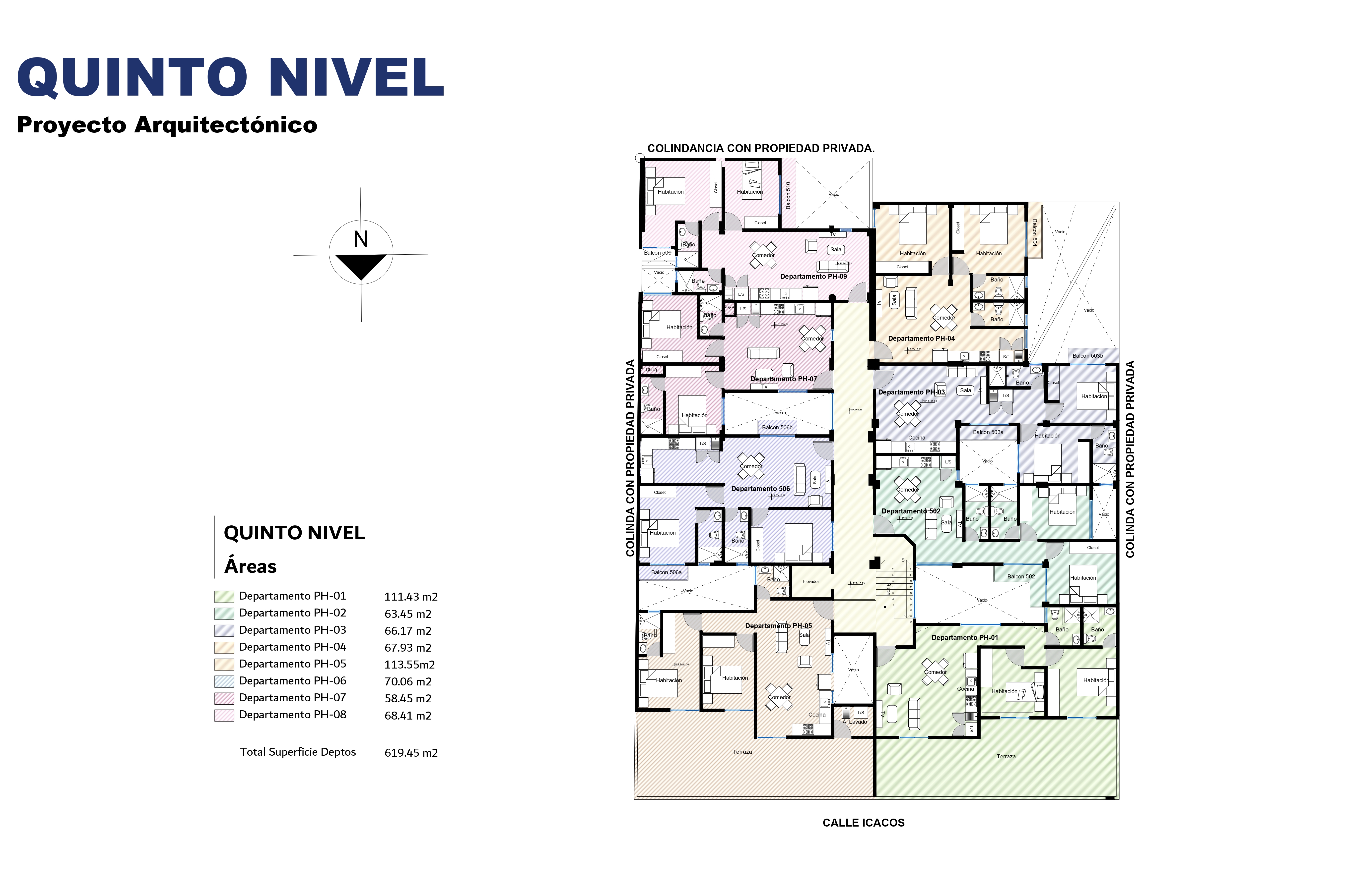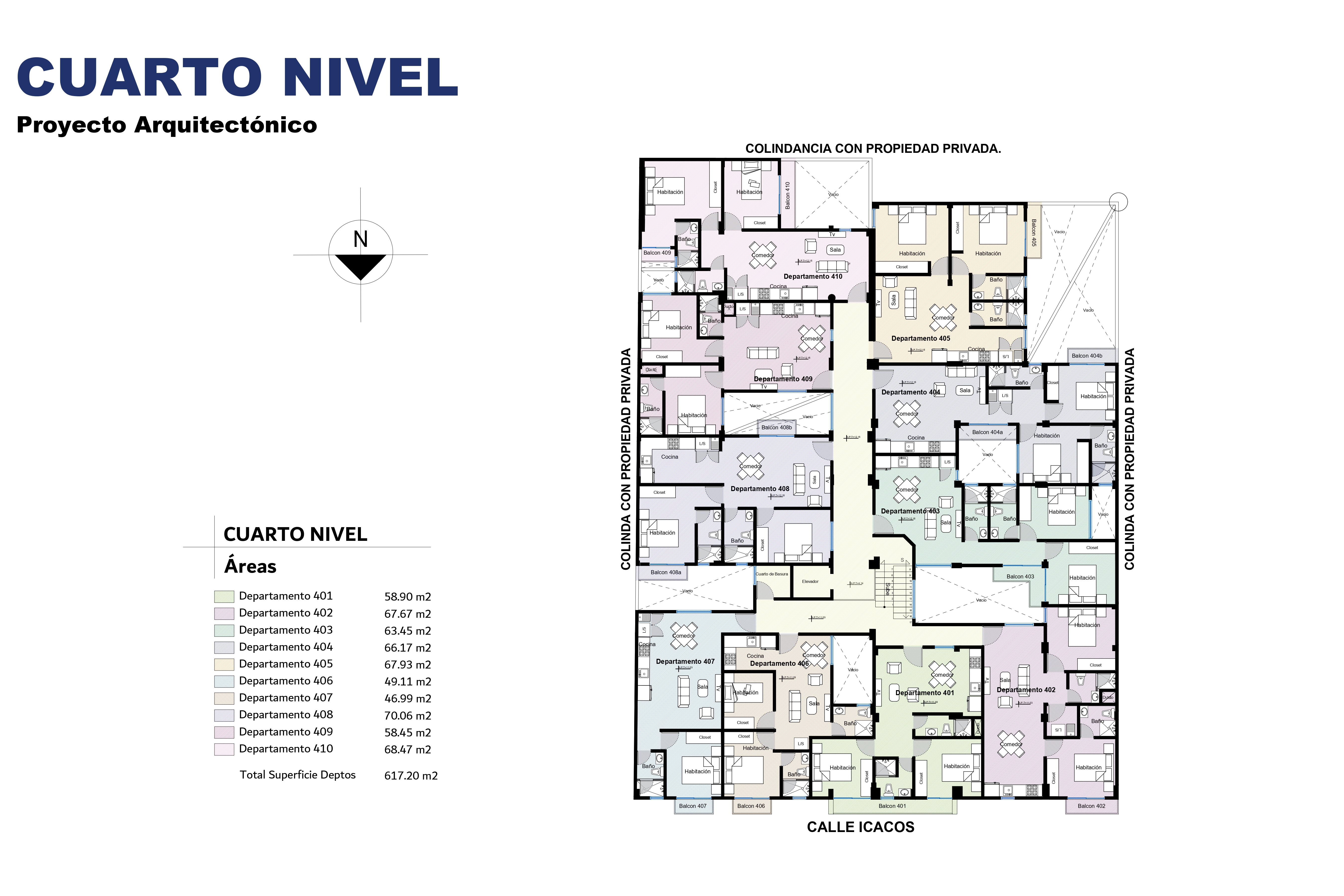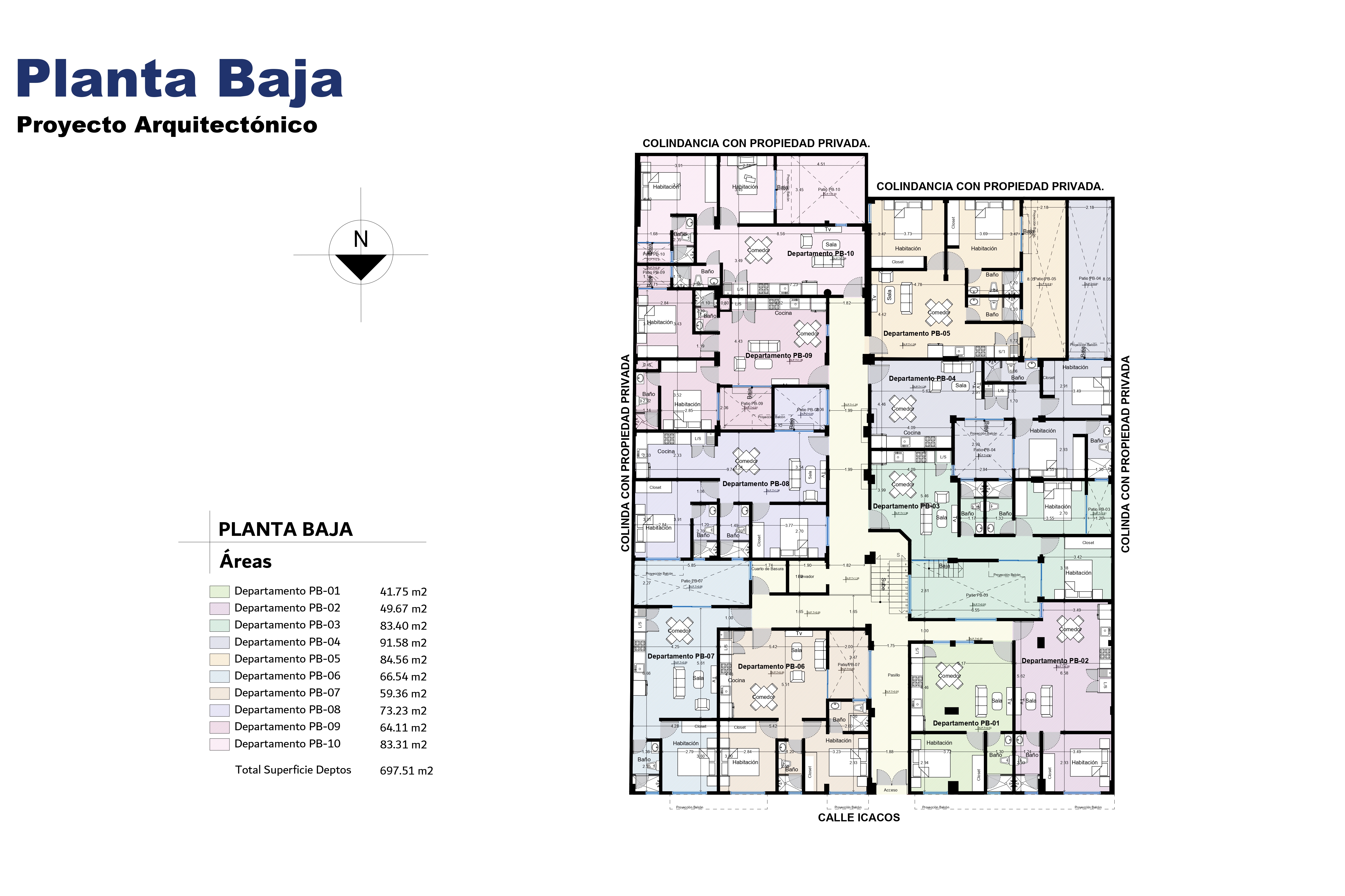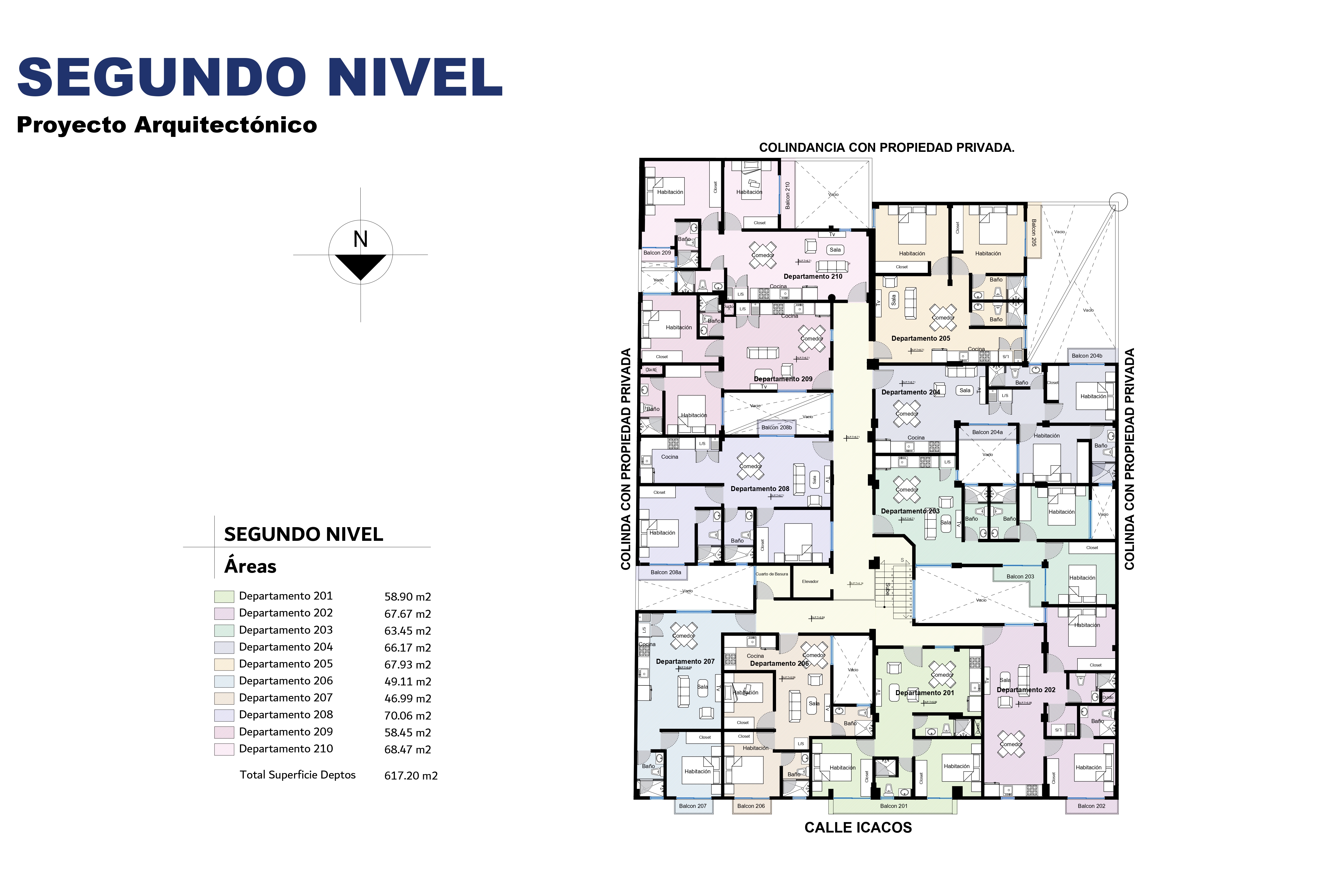 Departamentos desde 45.49 m2 hasta 79.16 m2 que consta de una o dos recámaras, cocina, sala-comedor y baño, algunos con patio, terraza o balcón.