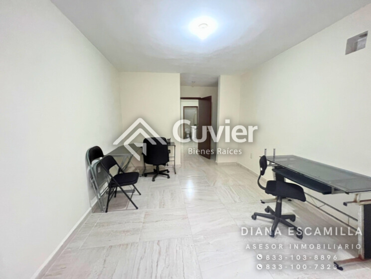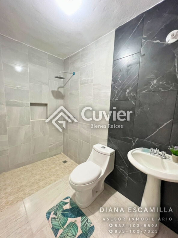 En la planta baja se encuentra la sala-comedor, una cocina integral con barra desayunadora, medio baño, una recámara con baño completo, área de lavado, patio trasero y cochera para dos autos.
