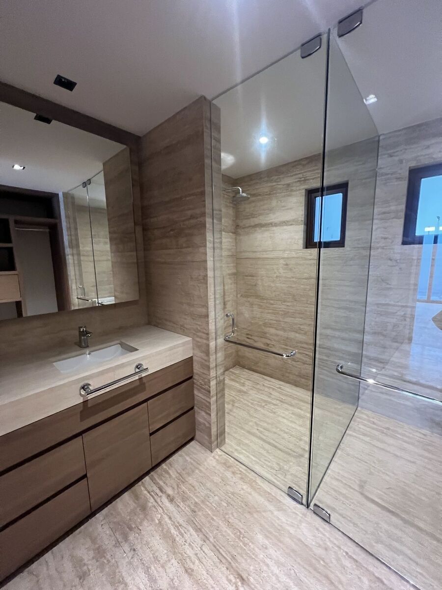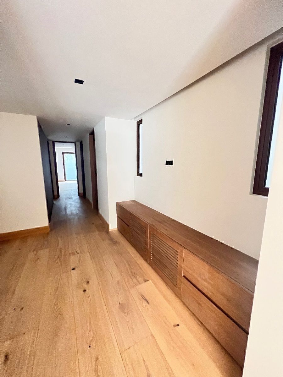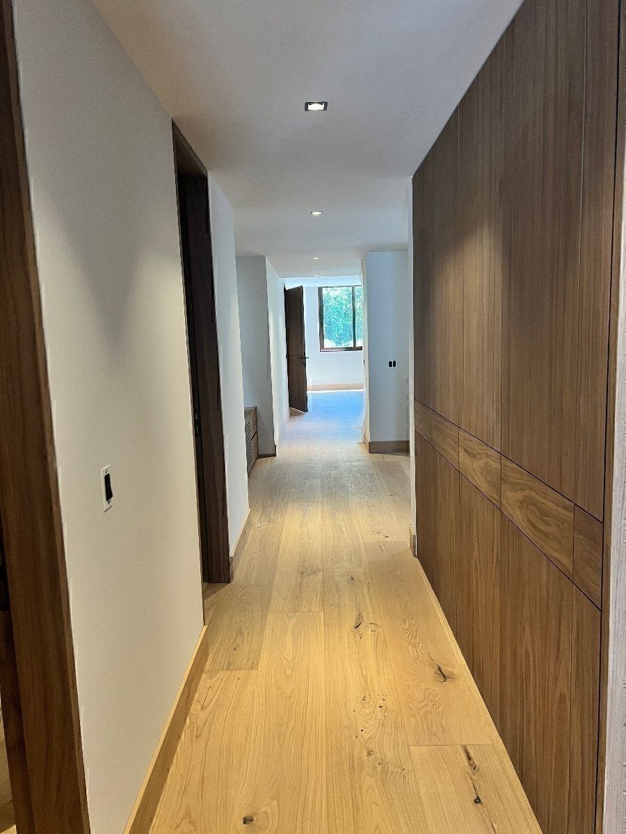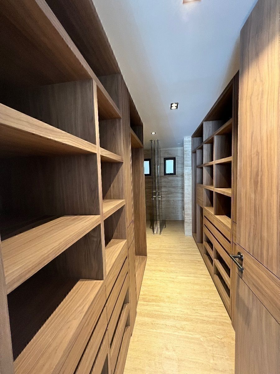 Acabados de lujo , closets y muebles empotrados de madera de nogal y mármol , pisos de madera . La cubierta de la cocina es de cuarzo blanco.