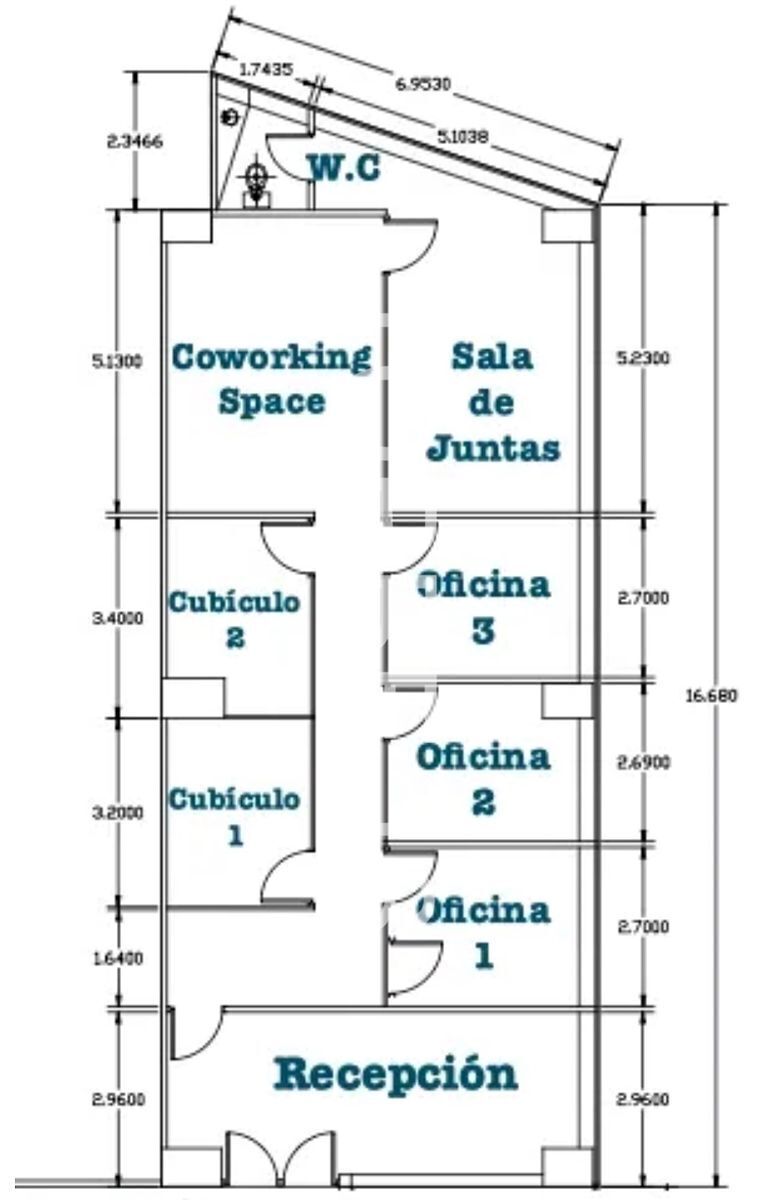 Recepción, 3 oficinas, 2 privados, sala de juntas, medio baño y espacio abierto para Staff. Acondicionada, no incluye el mobiliario.