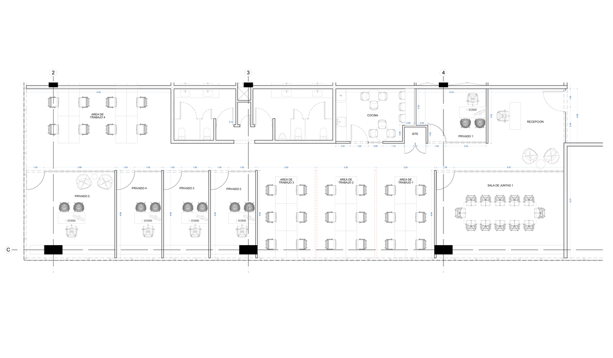 Areas: Recepción-espera, sala de juntas 12 personas, 5 privados, 2 areas abiertas de trabajo cap. 26 personas, baños H y M, cocineta-comedor y site.