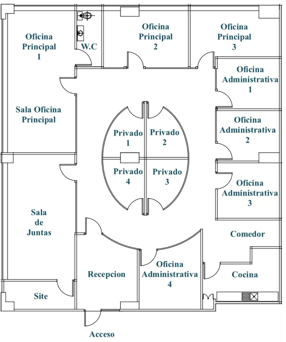 El espacio de oficina está con muy buen aprovechamiento del espacio. Recepción, Oficina de dirección con baño interno, sala de juntas, 6 oficinas privadas, 4 oficinas en el centro de forma circular centrales, área de comedor con cocina interior, baños por cada nivel, vigilancia 24/7, todo tipo de servicios cercanos.