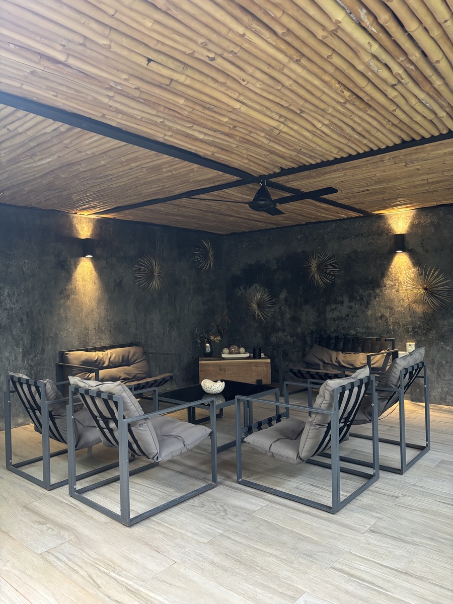 ▫️Terraza al aire libre con vegetación y área para fumar.