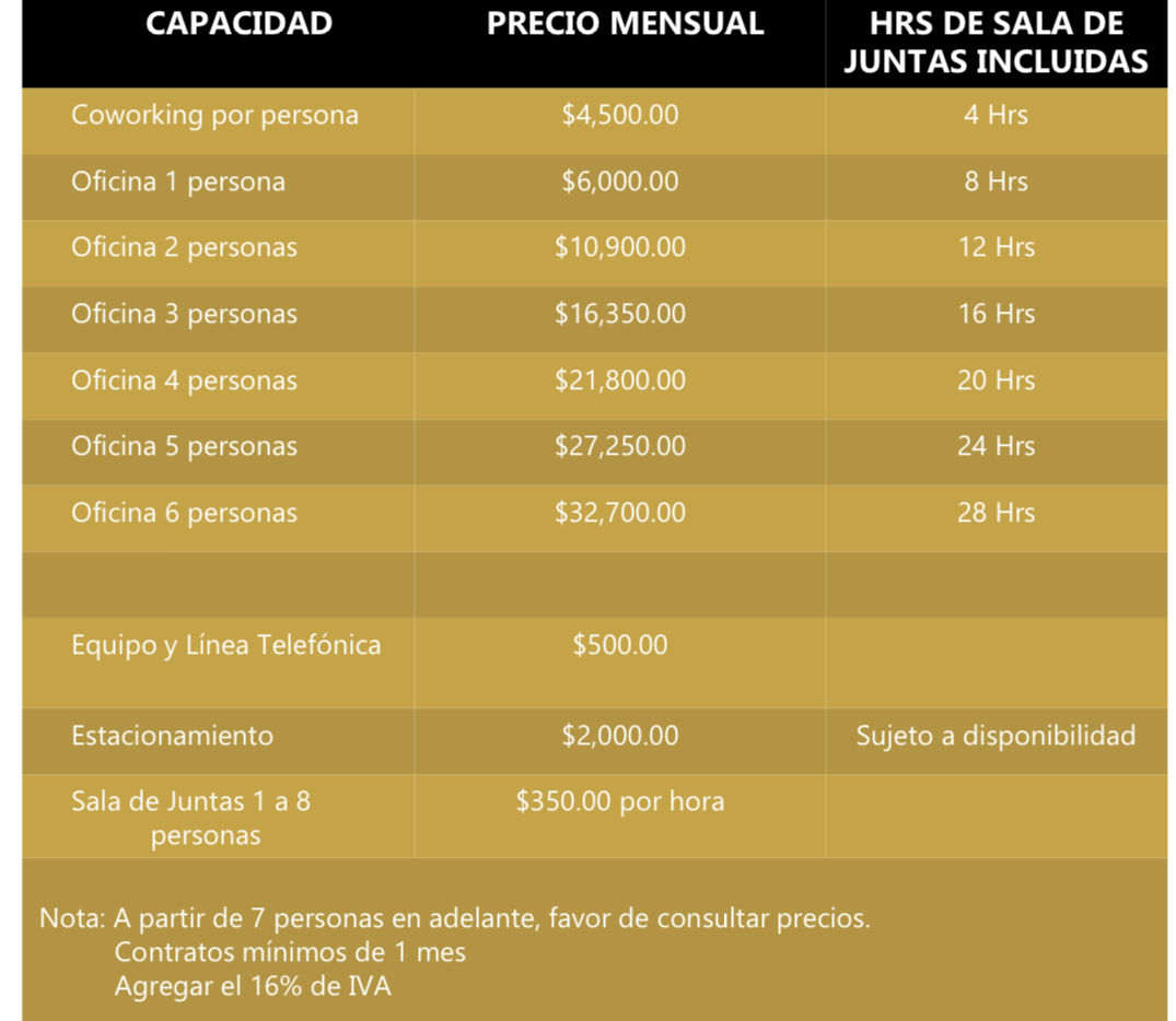 Nota: A partir de 7 personas en adelante, favor de consultar precios. Contratos mínimos de 1 mes