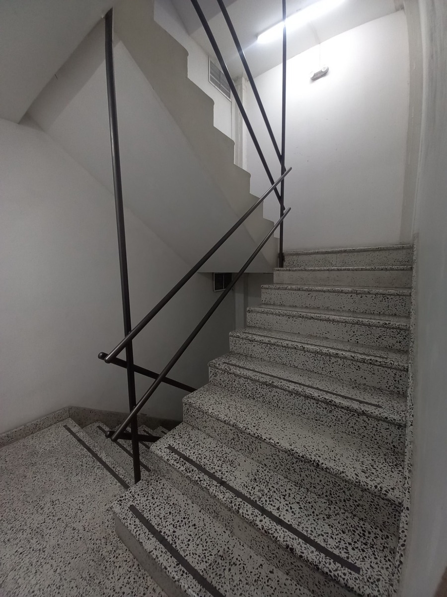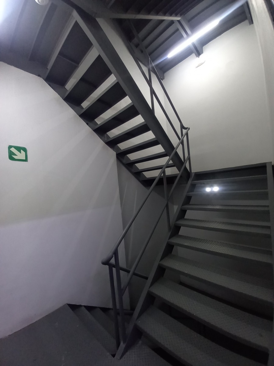 Doble escalera, la de emergencia de metal y la otra de granito.