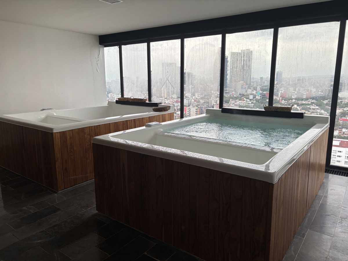 Gimnasio equipado exclusivo para dos personas con regaderas, lockers y Jacuzzi.