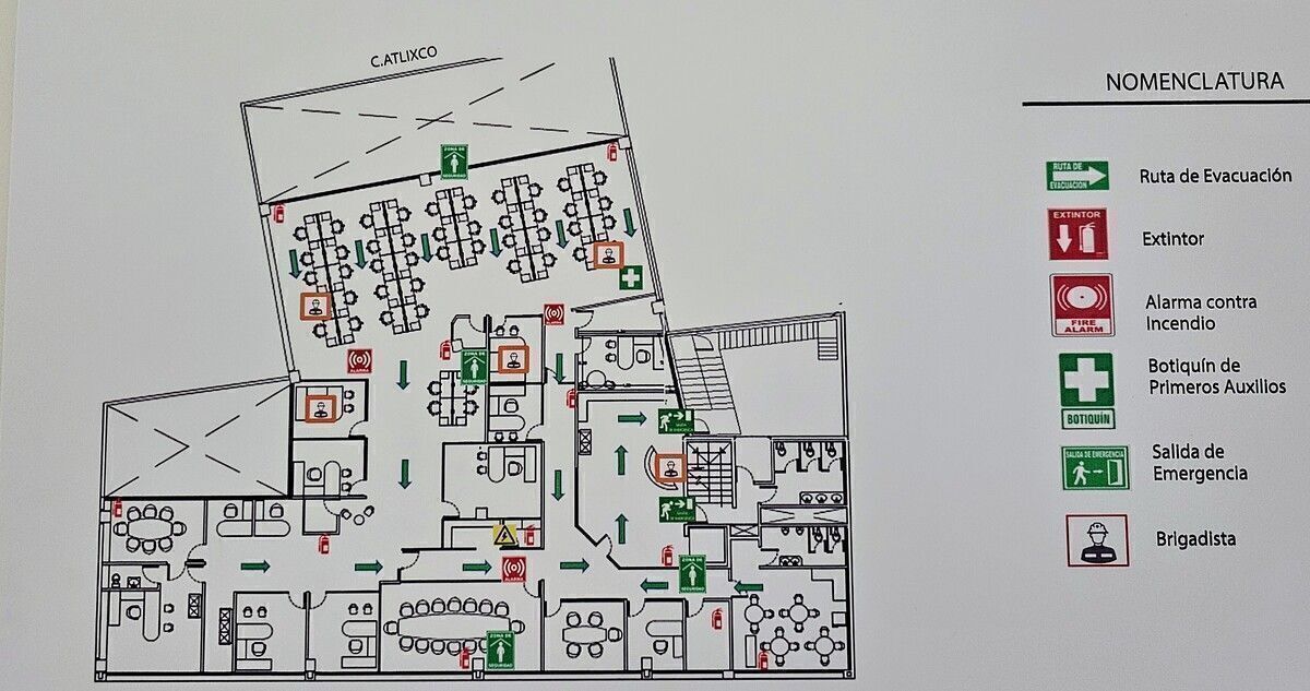Cuenta con, recepción, sala de juntas, oficinas ejecutiva con baño privado y sala de juntas, 4 oficinas directivas, 3 oficinas de área, 49 estaciones de trabajo, área de cafetería , área de site, 6 baños, 6 lugares de estacionamiento, seguridad las 24 hrs., limpieza en áreas comunes, cámaras de seguridad, elevador, escaleras de emergencia, control de acceso personalizado y grandes vías de comunicación.
