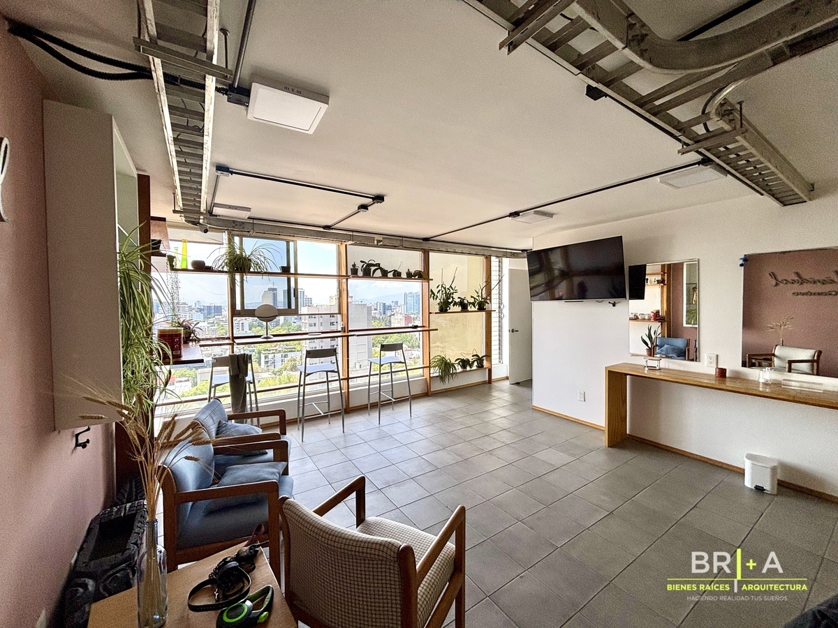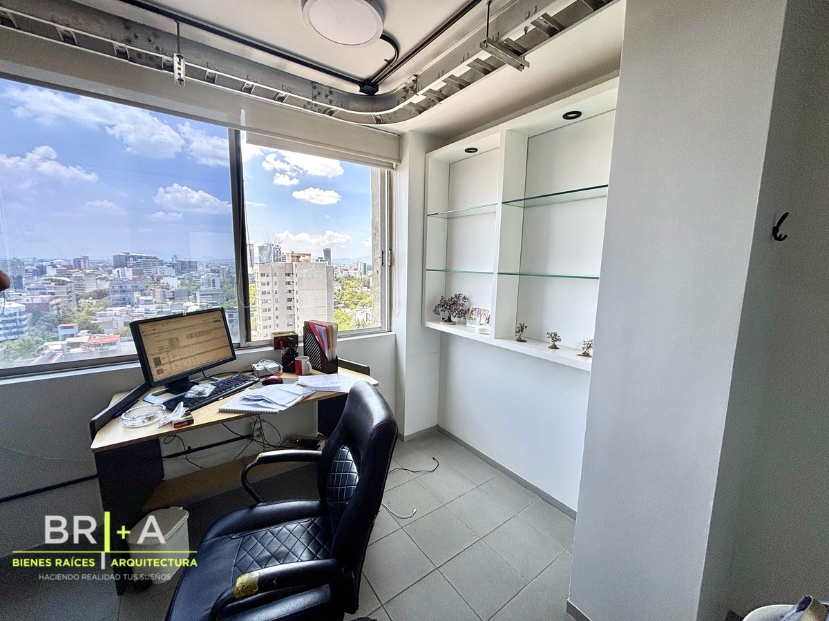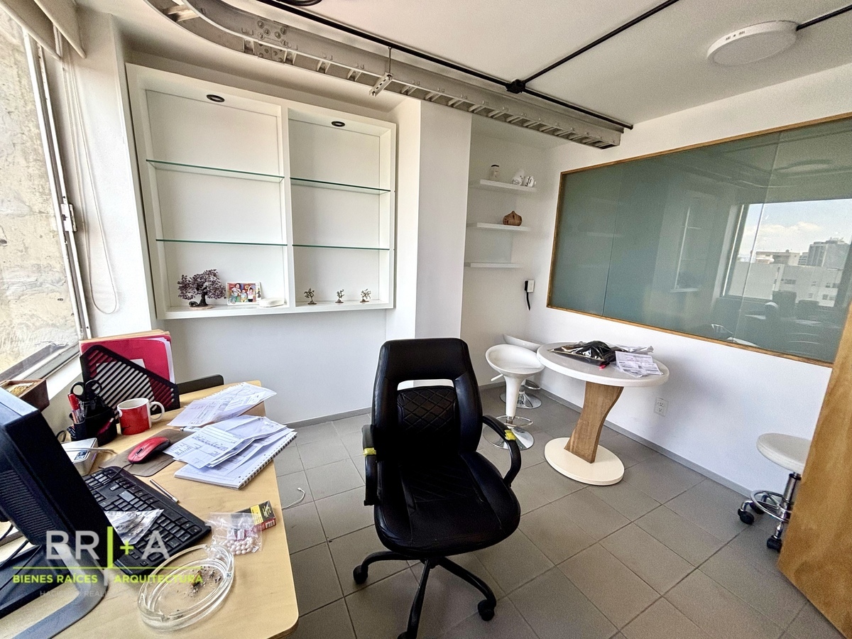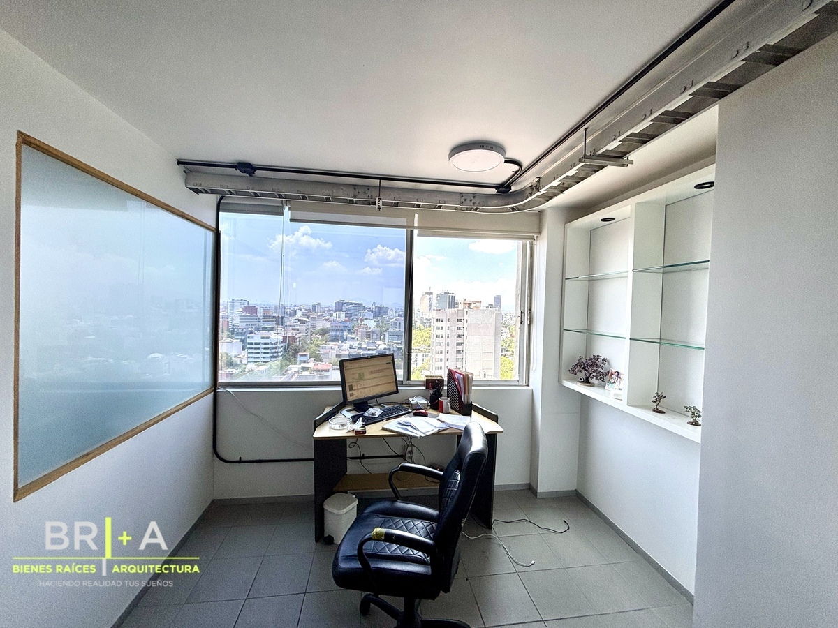 Oficina en renta en la condesa, estas oficinas se encuentran súper ubicadas en una de las mejores calles de la colonia, con mucha seguridad, muy iluminadas y en un piso alto con la mejor vista hacia la cuidad. Cuenta con 60m2 con un ambiente tranquilo para ser adaptado a sus necesidades con un espacio abierto el cual puede ser adaptado para showroom, espacio de trabajo o cubículos. Con acceso directo de los elevadores, con dos baños. Y cocineta compartidos con otra oficina, seguridad las 24 hrs y espacio para 1 lugar de estacionamiento.