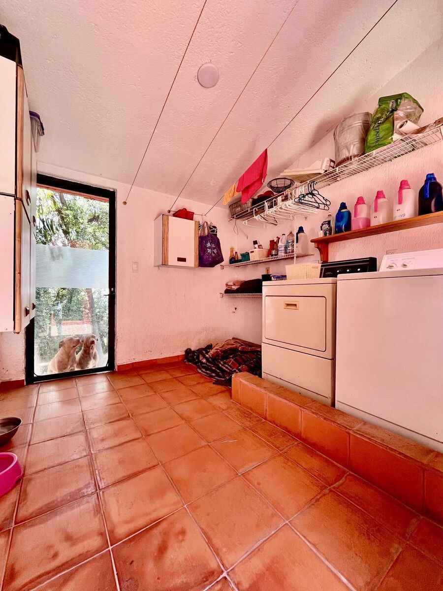 La cocina, recientemente remodelada, es el corazón de esta casa, con su diseño espacioso y moderno que fluye perfectamente hacia el comedor, ambos ofreciendo vistas serenas del entorno natural que rodea la propiedad.