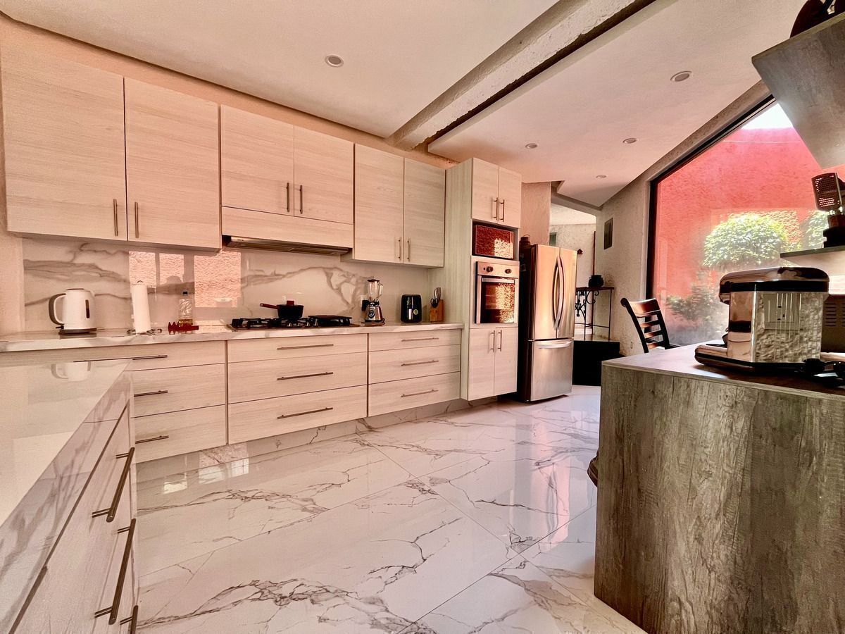 La cocina, recientemente remodelada, es el corazón de esta casa, con su diseño espacioso y moderno que fluye perfectamente hacia el comedor, ambos ofreciendo vistas serenas del entorno natural que rodea la propiedad.
