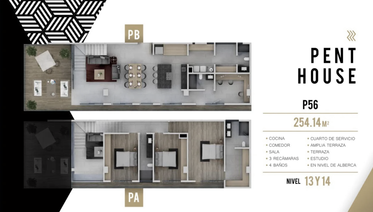 EL DESARROLLO TIENE ALBECA PANORÁMICA CON TERRAZA, GIMNASIO, ZONA DE YOGA O PILATES, Y ROOF TOP CON VISTA PANORÁMICA A TODA LA CIUDAD