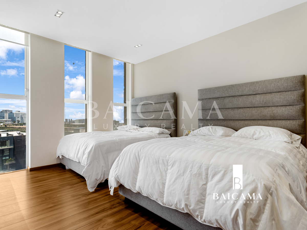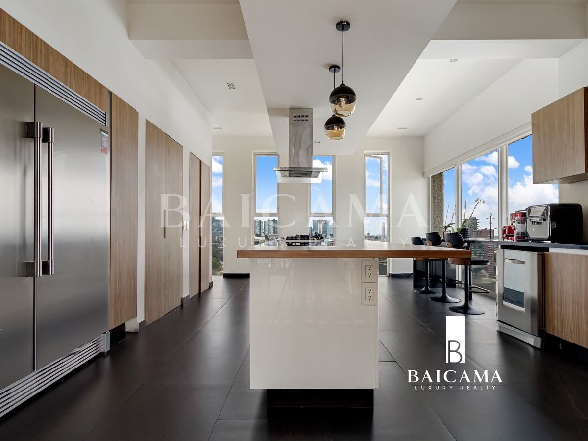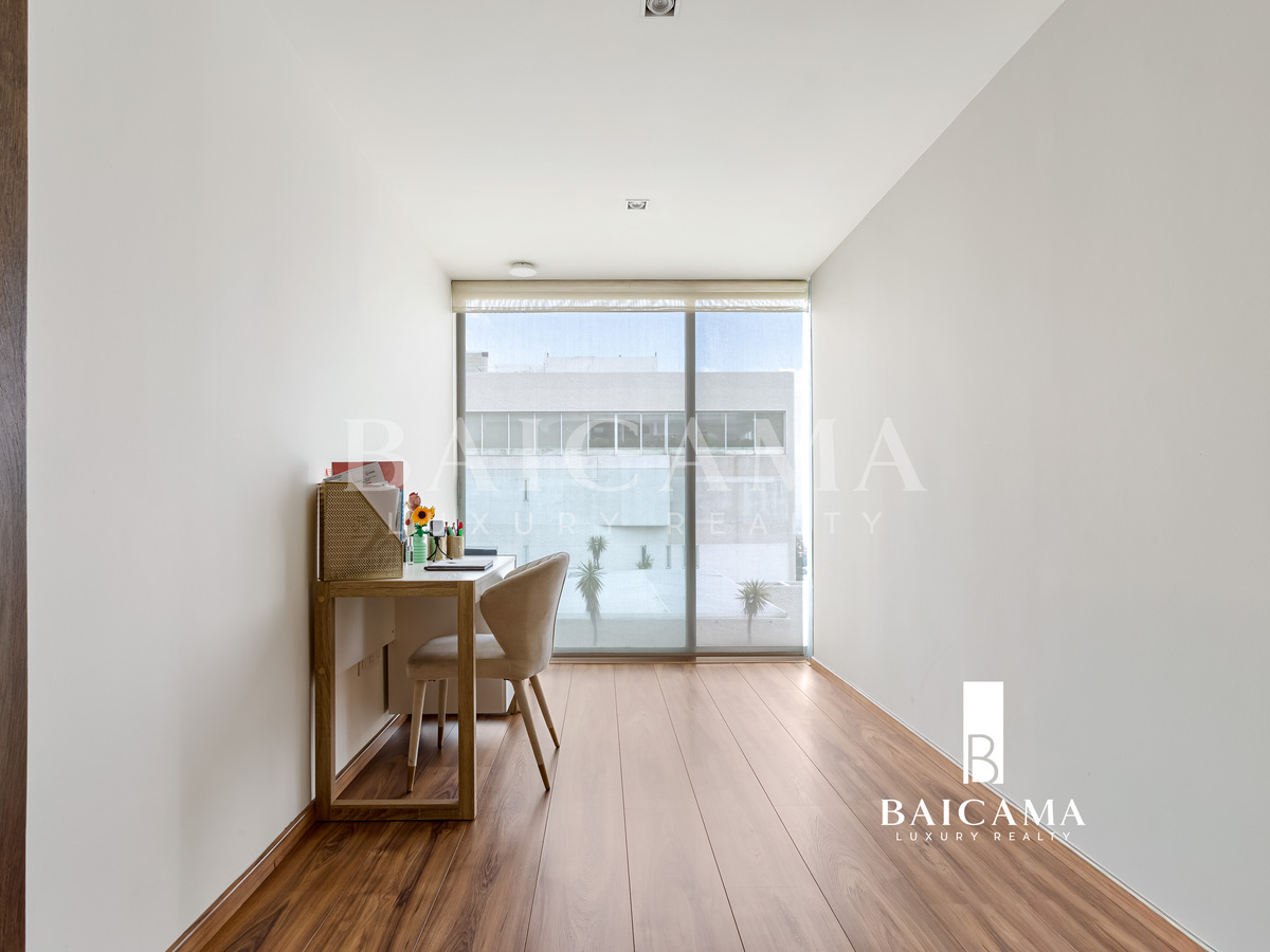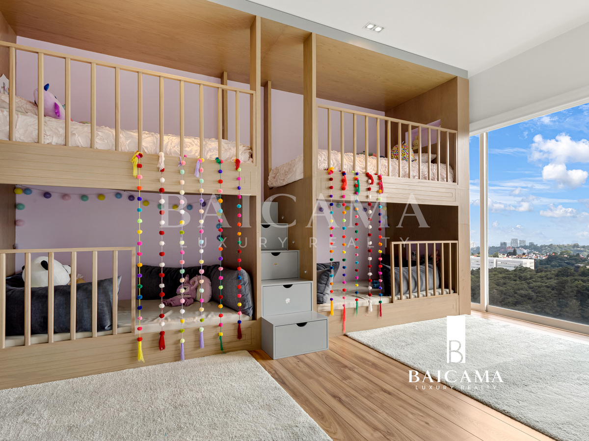 El nivel superior está concebido como un espacio social excepcional: una amplia sala y comedor enmarcados por ventanales de piso a techo, una cava con carácter, un bar con diseño escultural, y una terraza techada ideal para disfrutar atardeceres con total privacidad. La cocina de diseño contemporáneo cuenta con tres frentes de vista a la ciudad, dos alacenas y un diseño funcional que combina estética y comodidad. El área de servicio cuenta con dos cuartos de servicio de muy buen tamaño y área de lavado muy ampllia y funcional.
