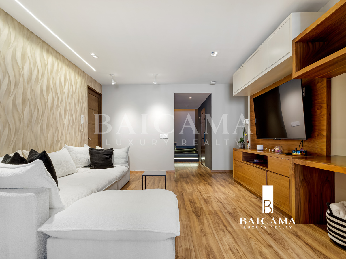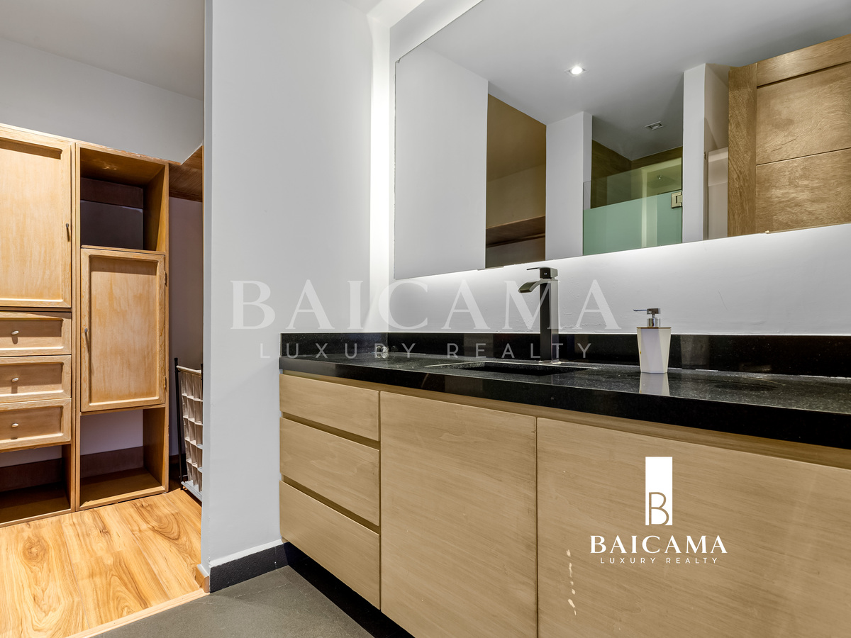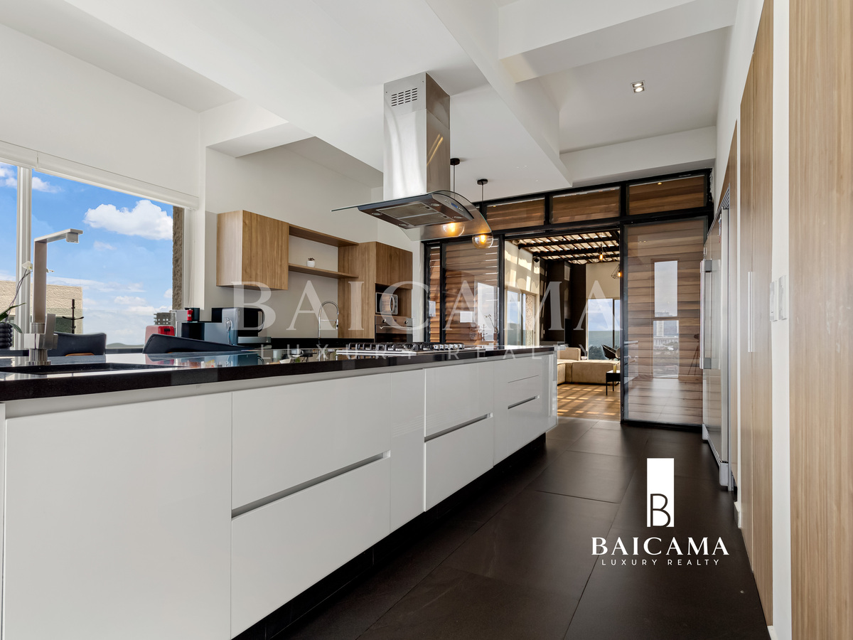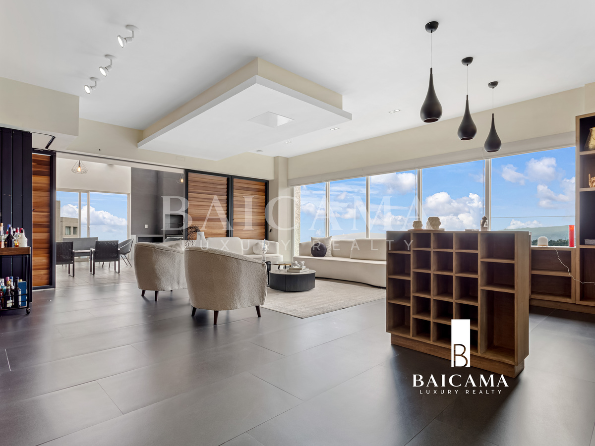 El nivel superior está concebido como un espacio social excepcional: una amplia sala y comedor enmarcados por ventanales de piso a techo, una cava con carácter, un bar con diseño escultural, y una terraza techada ideal para disfrutar atardeceres con total privacidad. La cocina de diseño contemporáneo cuenta con tres frentes de vista a la ciudad, dos alacenas y un diseño funcional que combina estética y comodidad. El área de servicio cuenta con dos cuartos de servicio de muy buen tamaño y área de lavado muy ampllia y funcional.