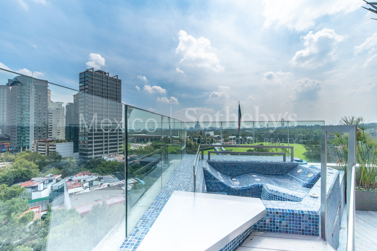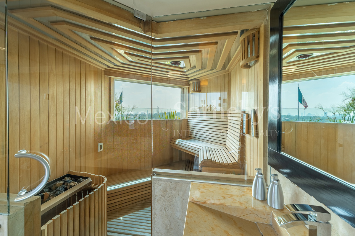 La recámara principal es un verdadero refugio con tina de hidromasaje, doble rain shower, regadera de shock frio, vapor y amplio walk-in clóset. La segunda recámara cuenta con baño con sauna y la misma vista inigualable al Campo Marte.